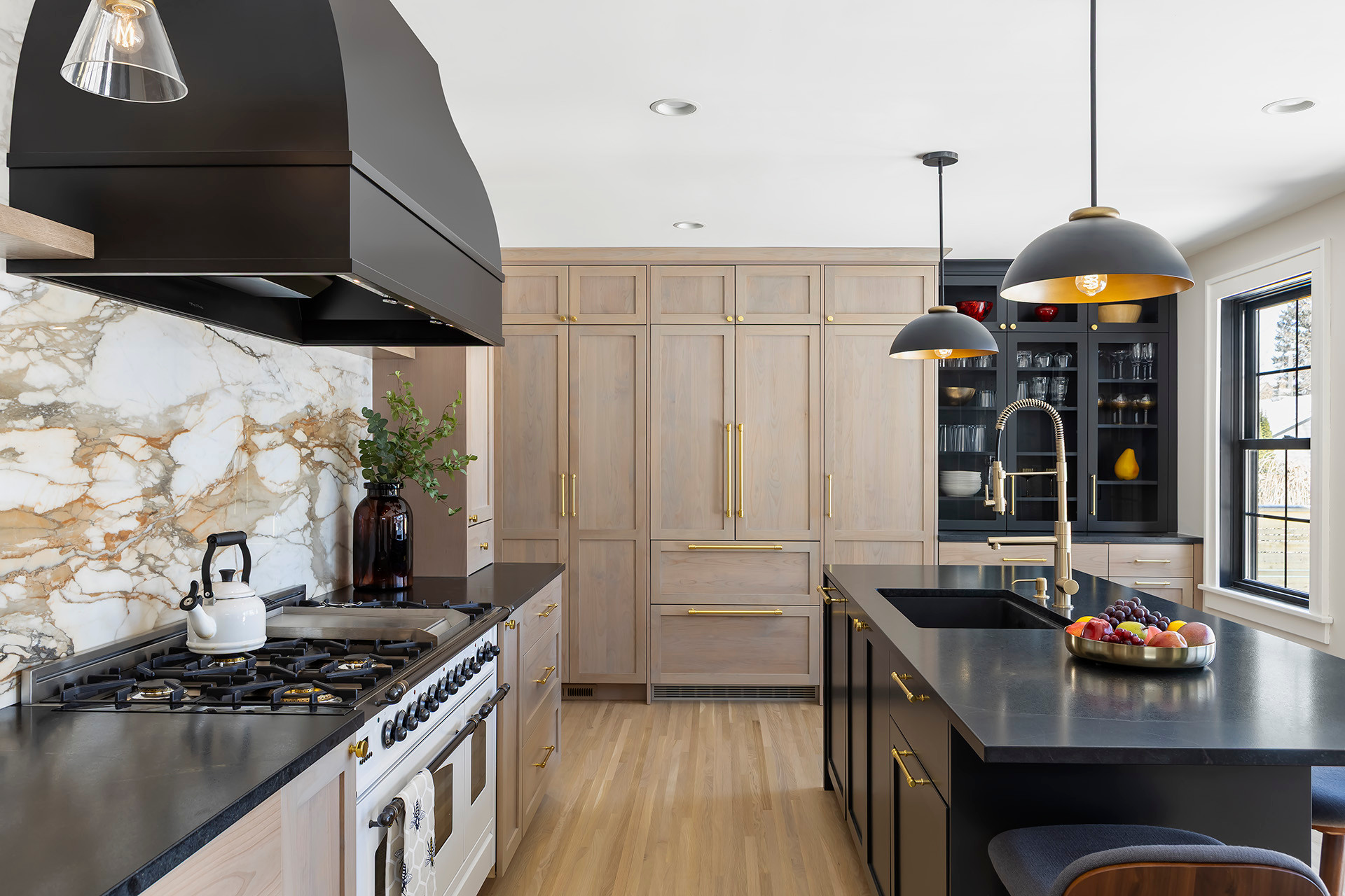 The kitchen features custom Shaker-style cabinets in a mix of black and wood units. Polished gold-tone knobs and pulls add refined accents. “The clients were really interested in not having a monolithic look with their cabinetry,” says Mark Ferraro-Hauck, director of design at Bluestem Remodeling. “I love the repeated black throughout the room, but it’s not a black kitchen.”
