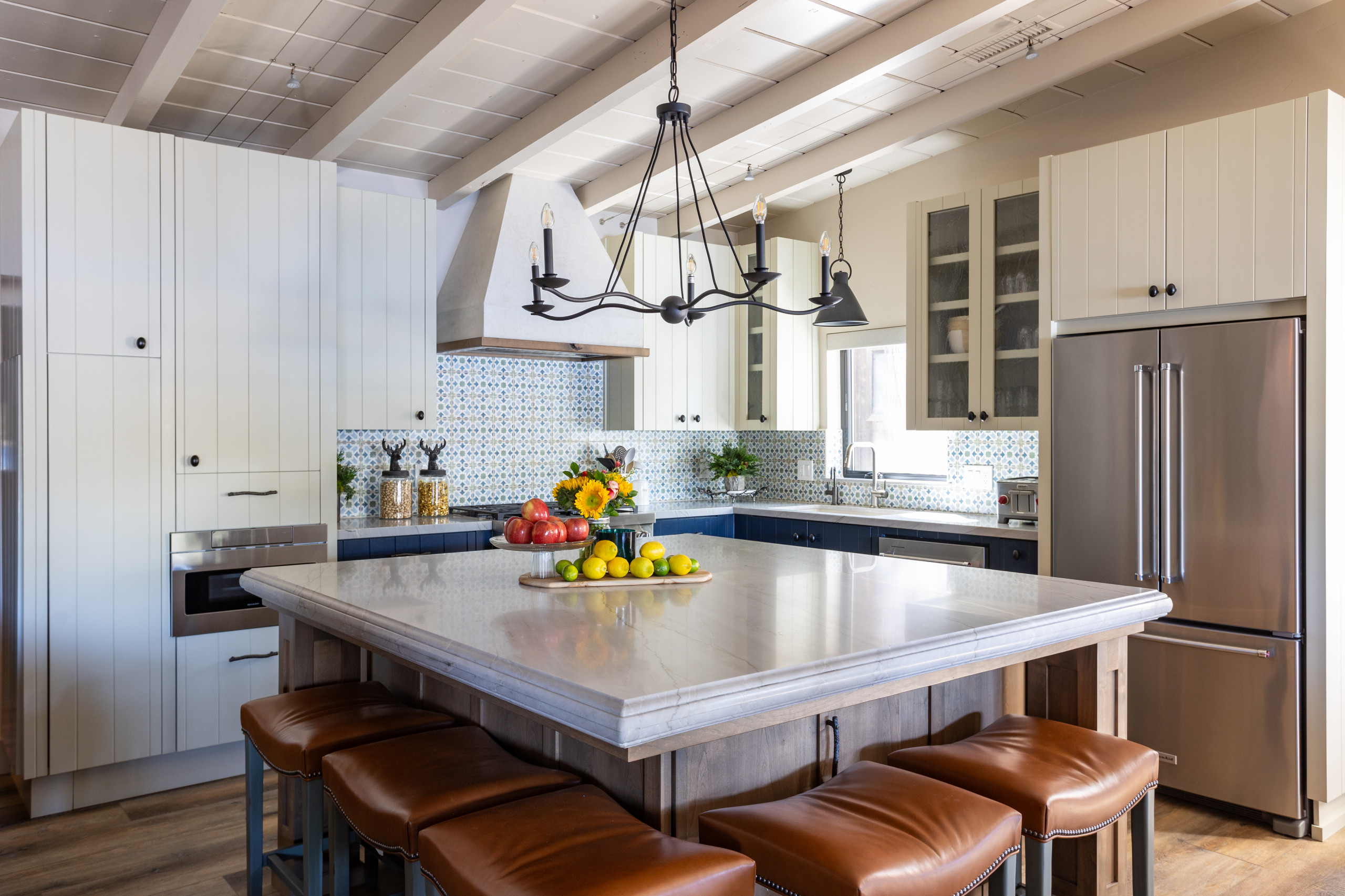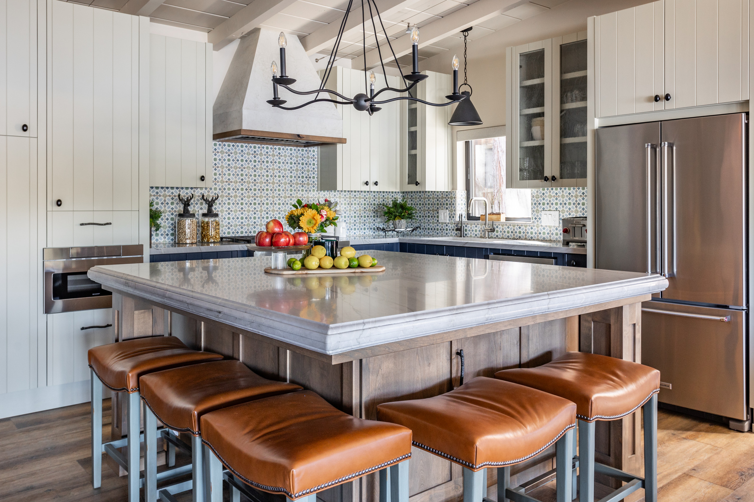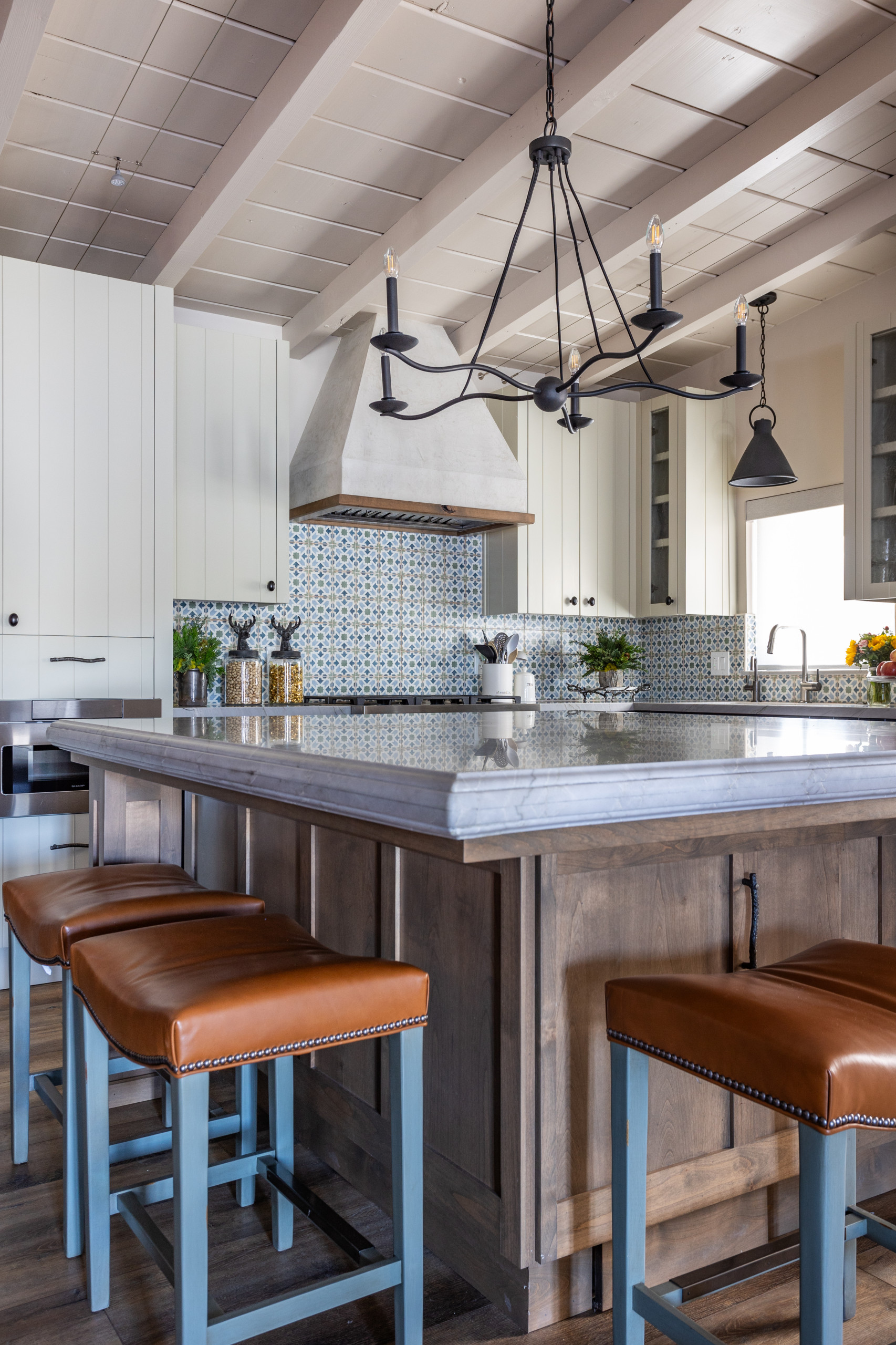 The leather-upholstered counter stools are traditional yet comfortable. “These are mostly for the kids,” Glaister says. “We didn’t want stools with backs because we wanted to show off that countertop edge. But these swoop-shaped seats are very comfortable.” Painted blue legs reflect the backsplash tile, and the nailhead trim adds a rustic touch.