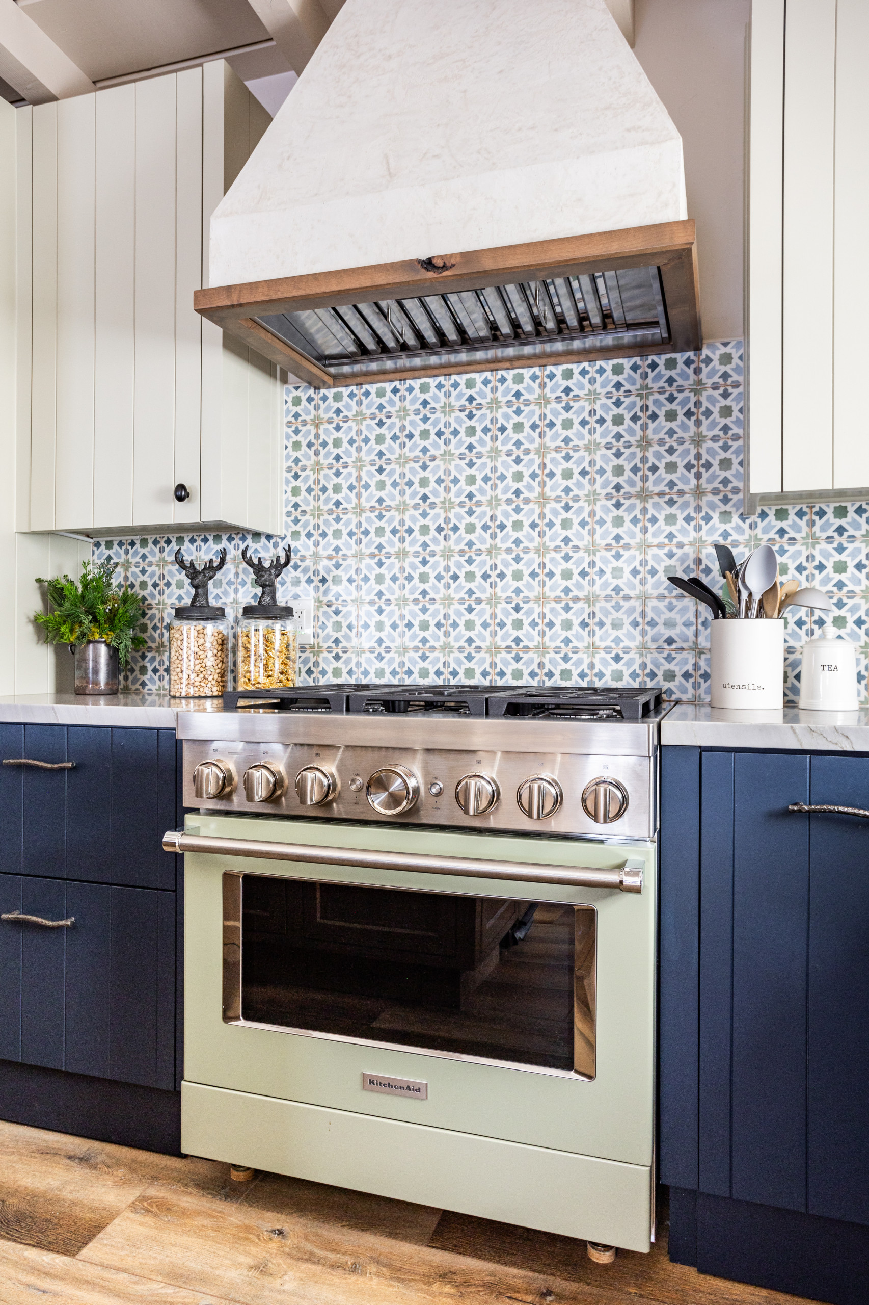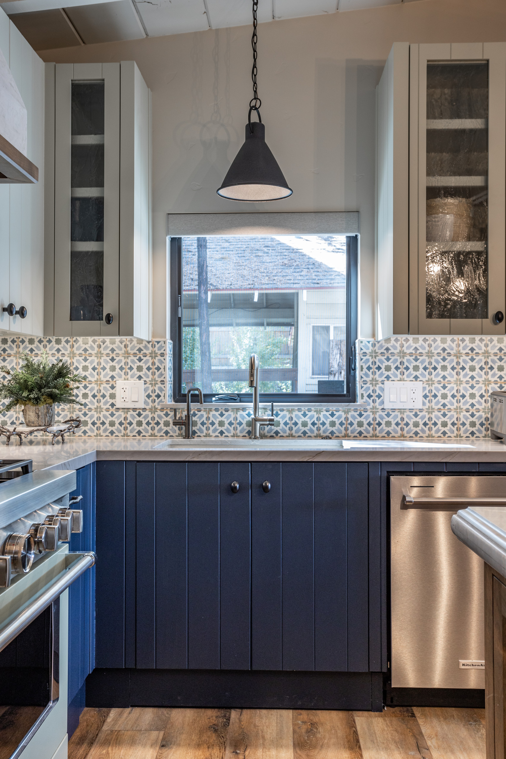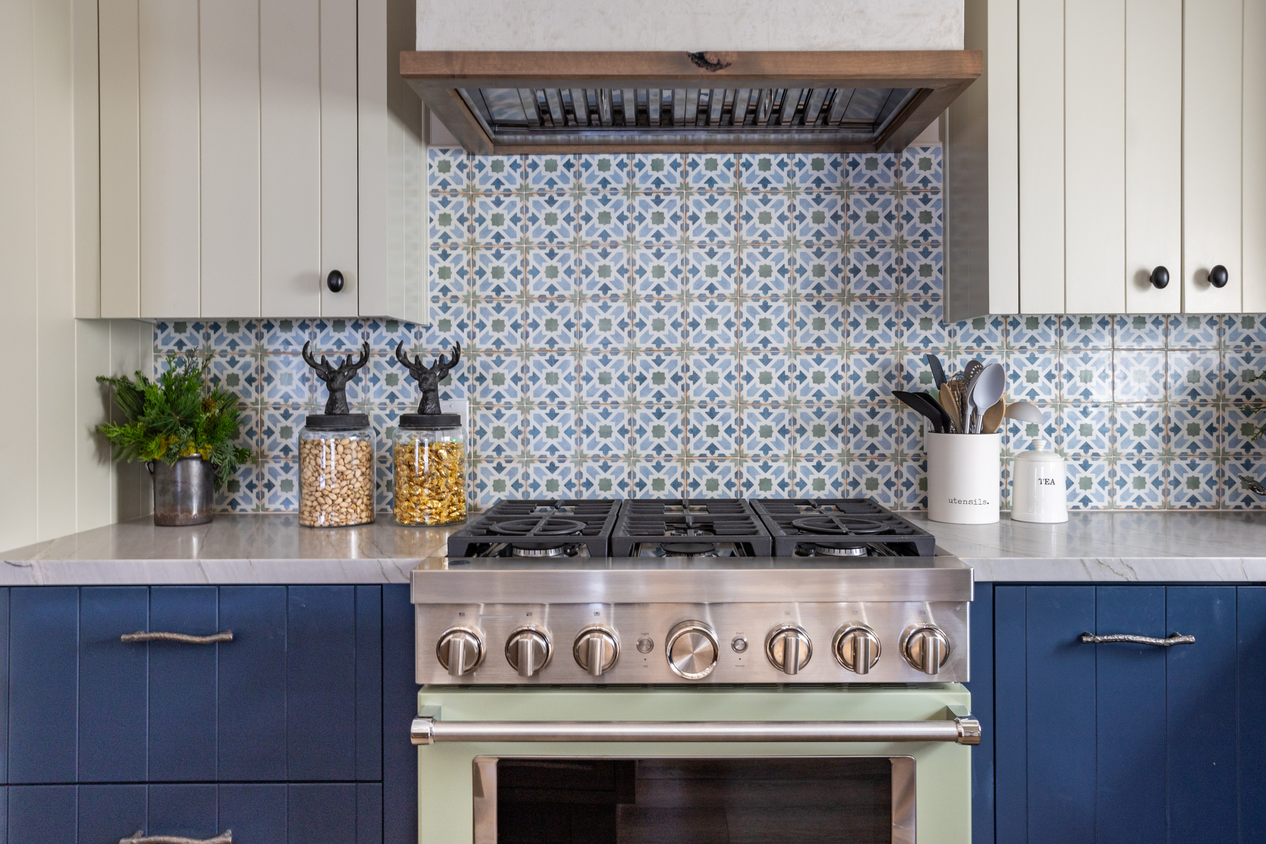 Glaister looked to the tile for cabinet colors, contrasting the upper and lower cabinetry. The lower cabinets, painted Starless Night by Behr, bring out the blue in the backsplash. The upper and pantry cabinets, painted in Cargo Pants by Sherwin-Williams, add a warm cream tone. The grooved cabinet doors and drawers are a throwback to lake cabin style of another era.