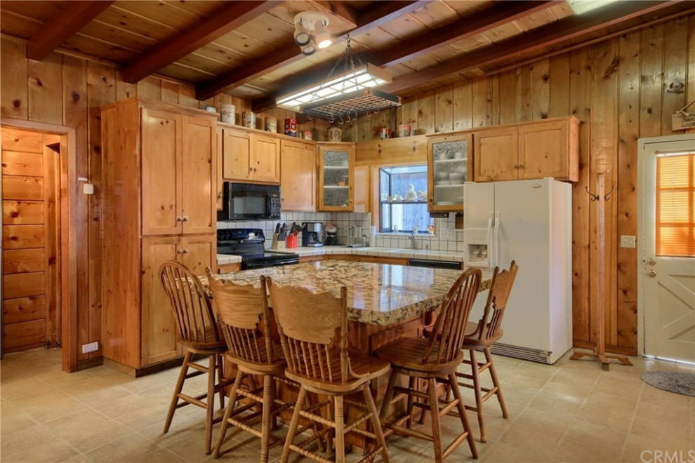 After: To preserve the kitchen’s architectural integrity and character, they kept the wood beams but painted the rest of the kitchen’s dated woodwork. “Some people might not like that we painted the ceiling,” Glaister says. “But the wood was so old, orange and heavy-looking. We needed it to look clean and light. However, the V-groove paneling was very helpful for adding texture and rustic charm, and we were glad it was there.