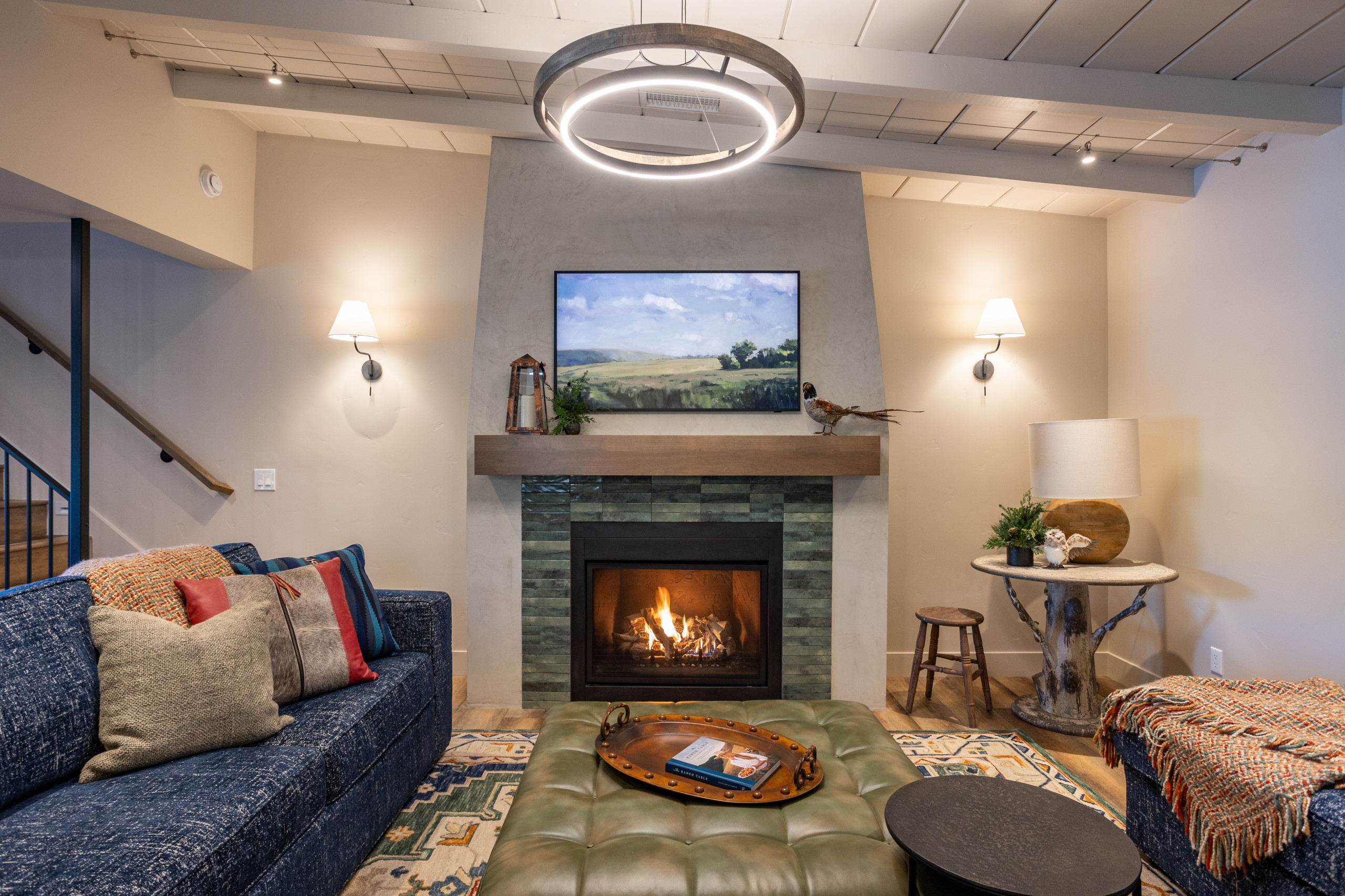 The updated flooring is hickory luxury vinyl planks, a durable material that has the look of wood but is waterproof and can withstand heavy foot traffic. “Our clients wanted their guests to be able to relax here, which meant they did not want anyone to worry about damaging anything,” the designer says.