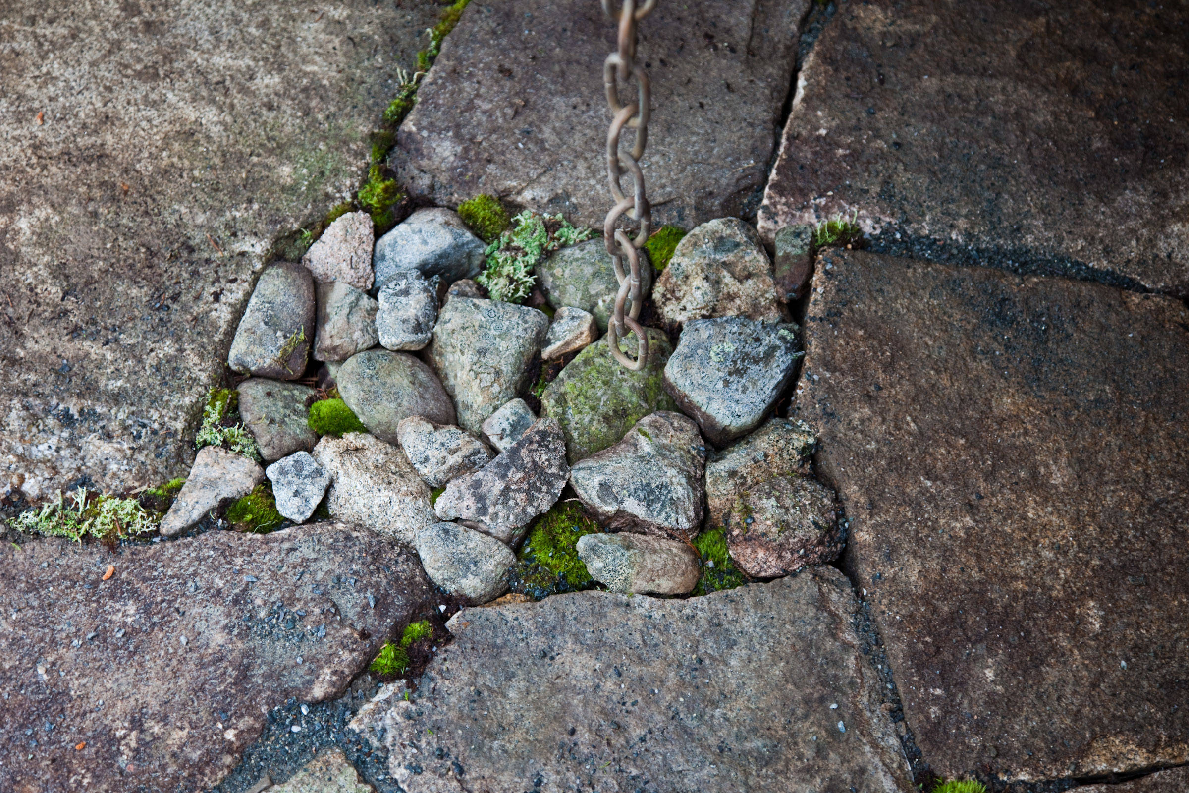 Irregularly shaped granite surrounds granite fieldstone at the end of a rain chain.