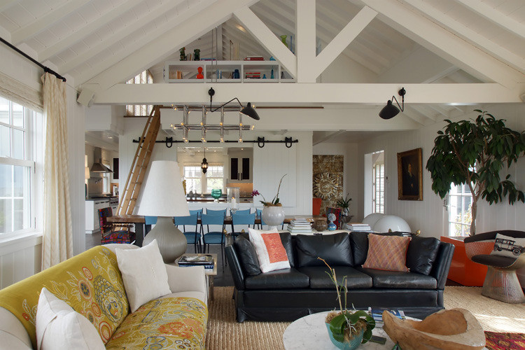 The angled arms play off the diagonals on these beams, while their black color contrasts with the white paint.
