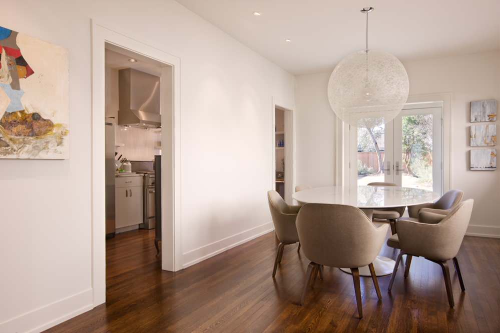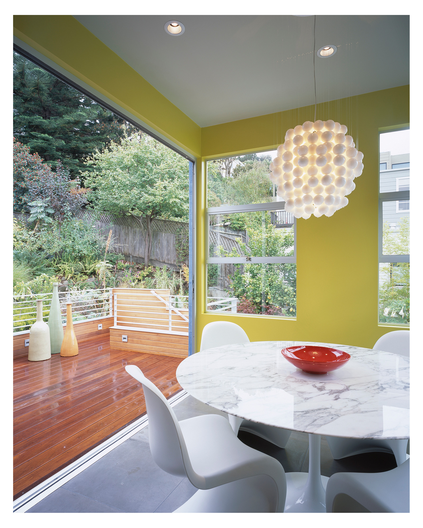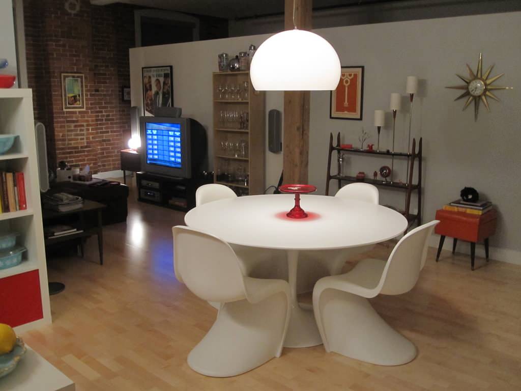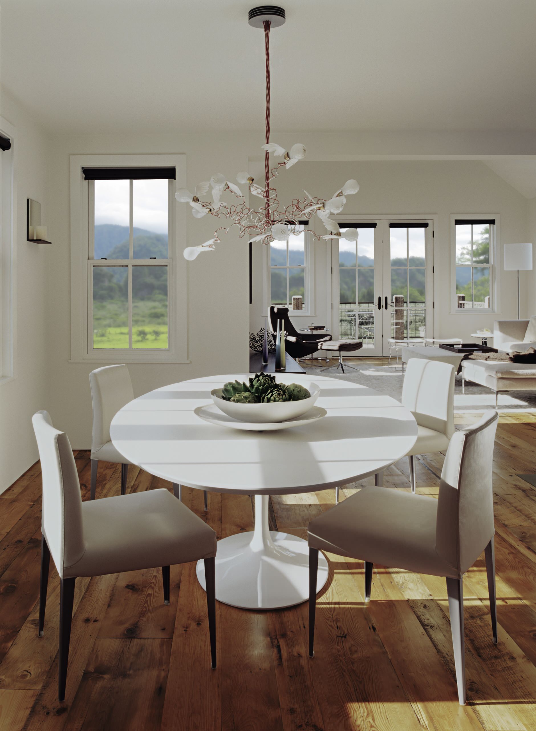 Here the dining area goes for an all-white palette, gaining color only from tabletop accessories. The Tulip's partners include an FL/Y pendant and four Panton chairs.