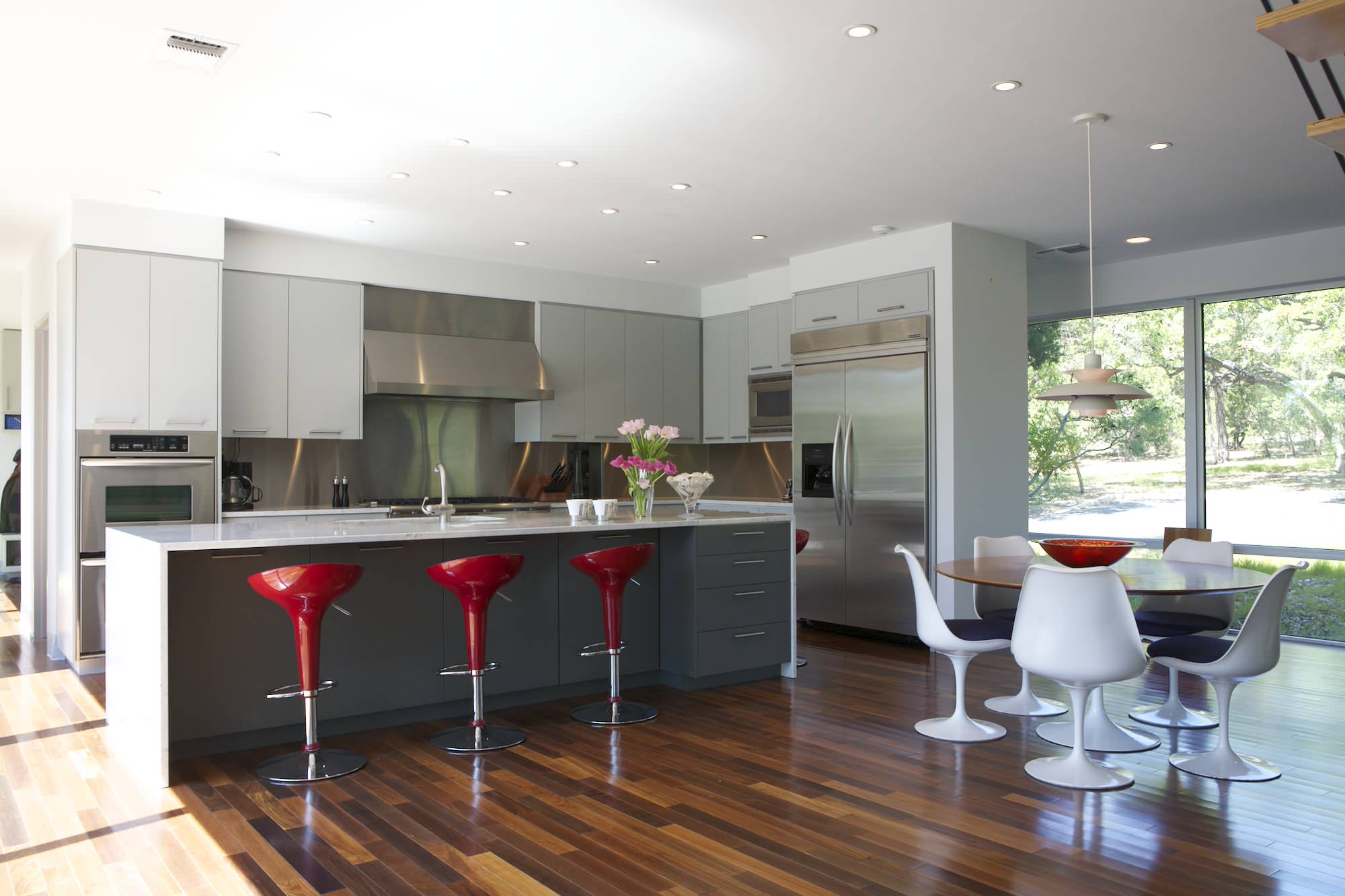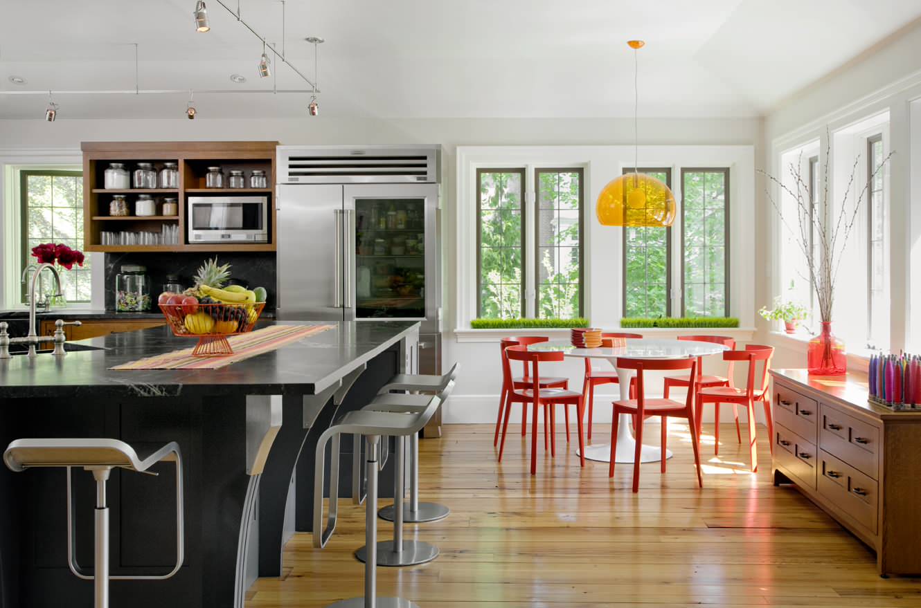 I shouldn't play favorites, but this is one kitchen on Houzz I come back to over and over again. It's modern yet warm, rather neutral but enlivened by the yellow FL/Y pendant and the red chairs. The white Tulip table is a great centerpiece for the room's burst of color.