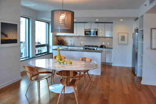 Cherner armchairs are a great match for this white marble oval version of the table. These choices work wonderfully for this white room with wood floors.