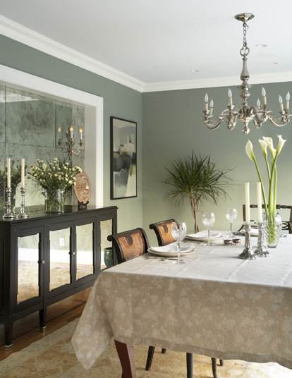 This interior illustrates how a warm, neutral wall color throughout an open floor plan, along with lots of different light sources, draws your eye all around the space and expands the sense of size.