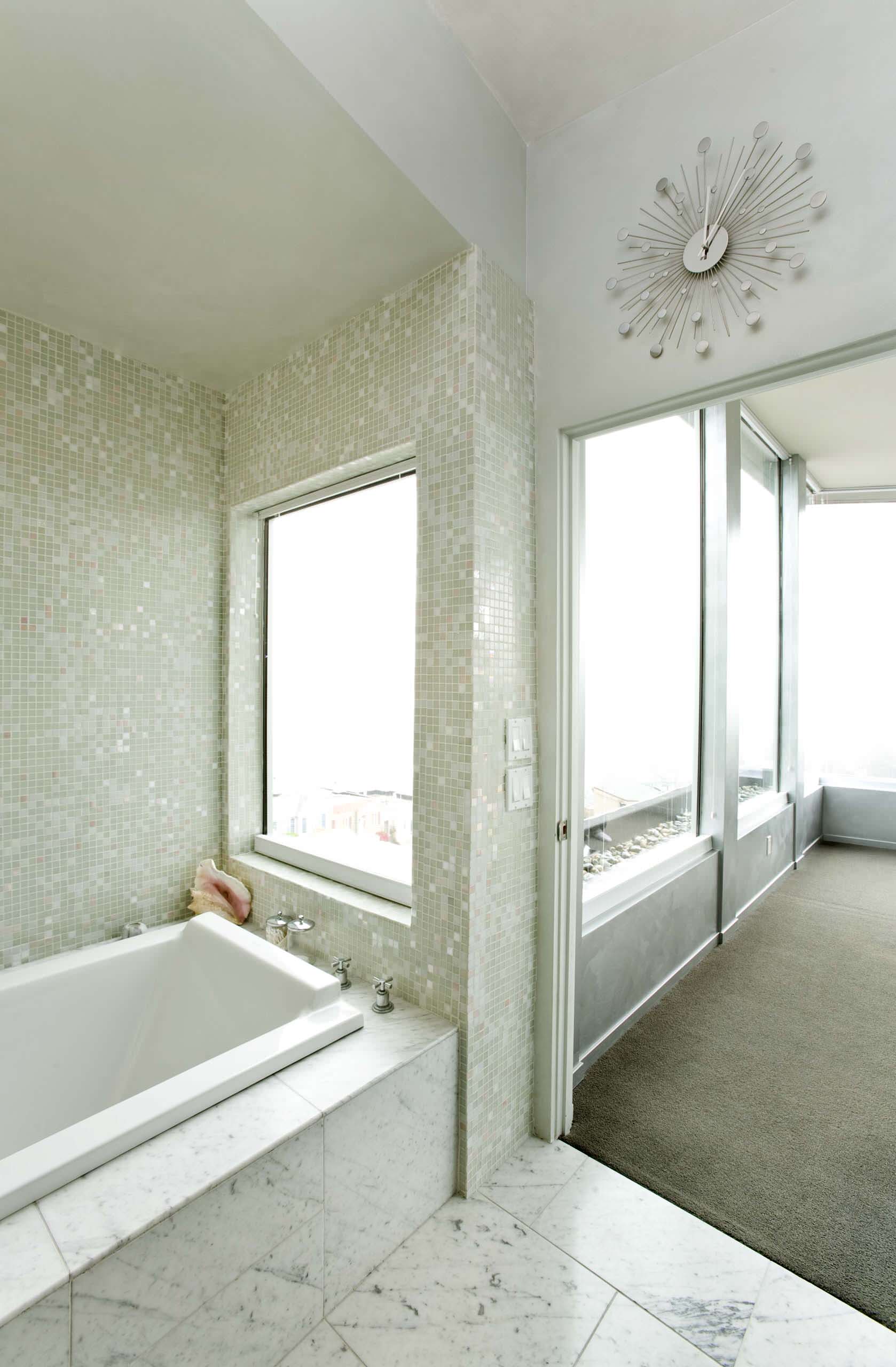 A melange of mosaic tiles provide a pearlescent backdrop to a indulgent soaker tub. When the night falls, create a romantic experience by lighting pillar candles and watching the candlelight dance along the shimmering walls.