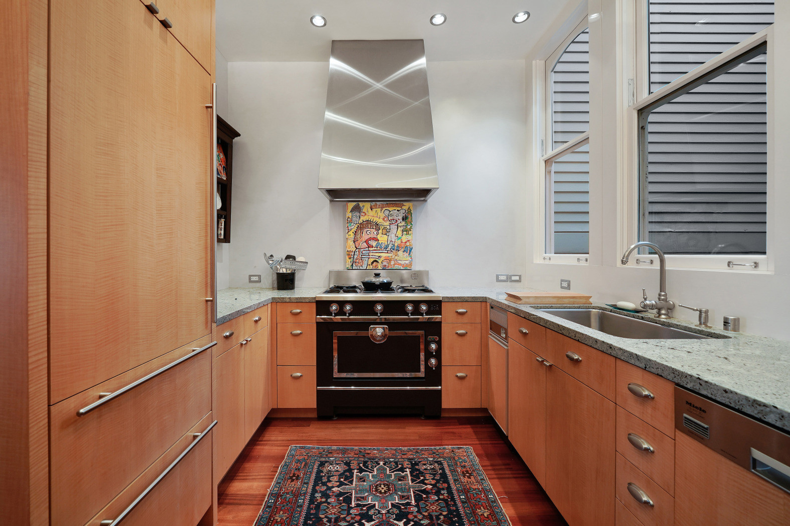 The three-zone layout still works for smaller kitchens, such as this handsome U-shaped space.