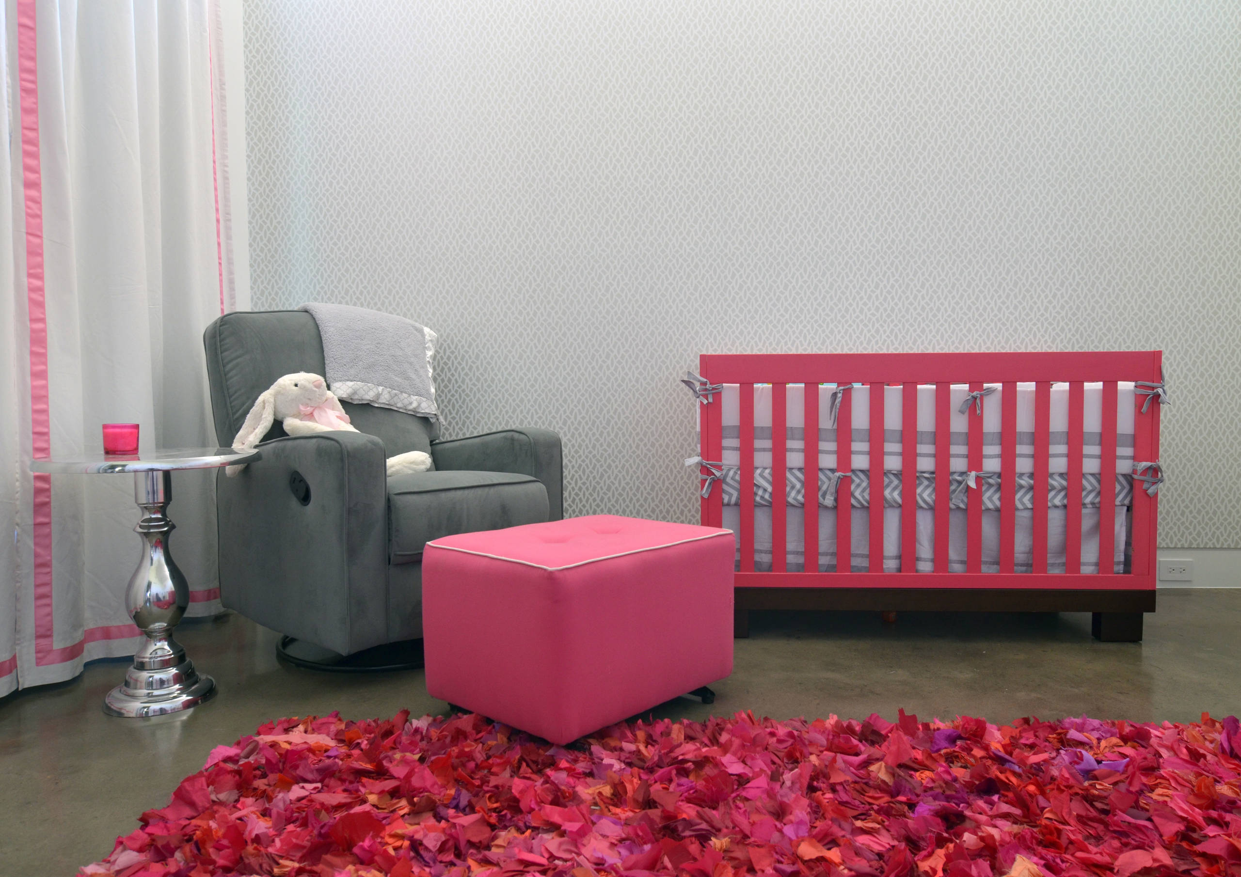 Seven-month-old Ainsley has a sleek, modern nursery on the ground floor with her parents. Melissa paired screaming hot pink with soft gray. A plush upholstered glider from Wayfair is the perfect place to rock her baby.