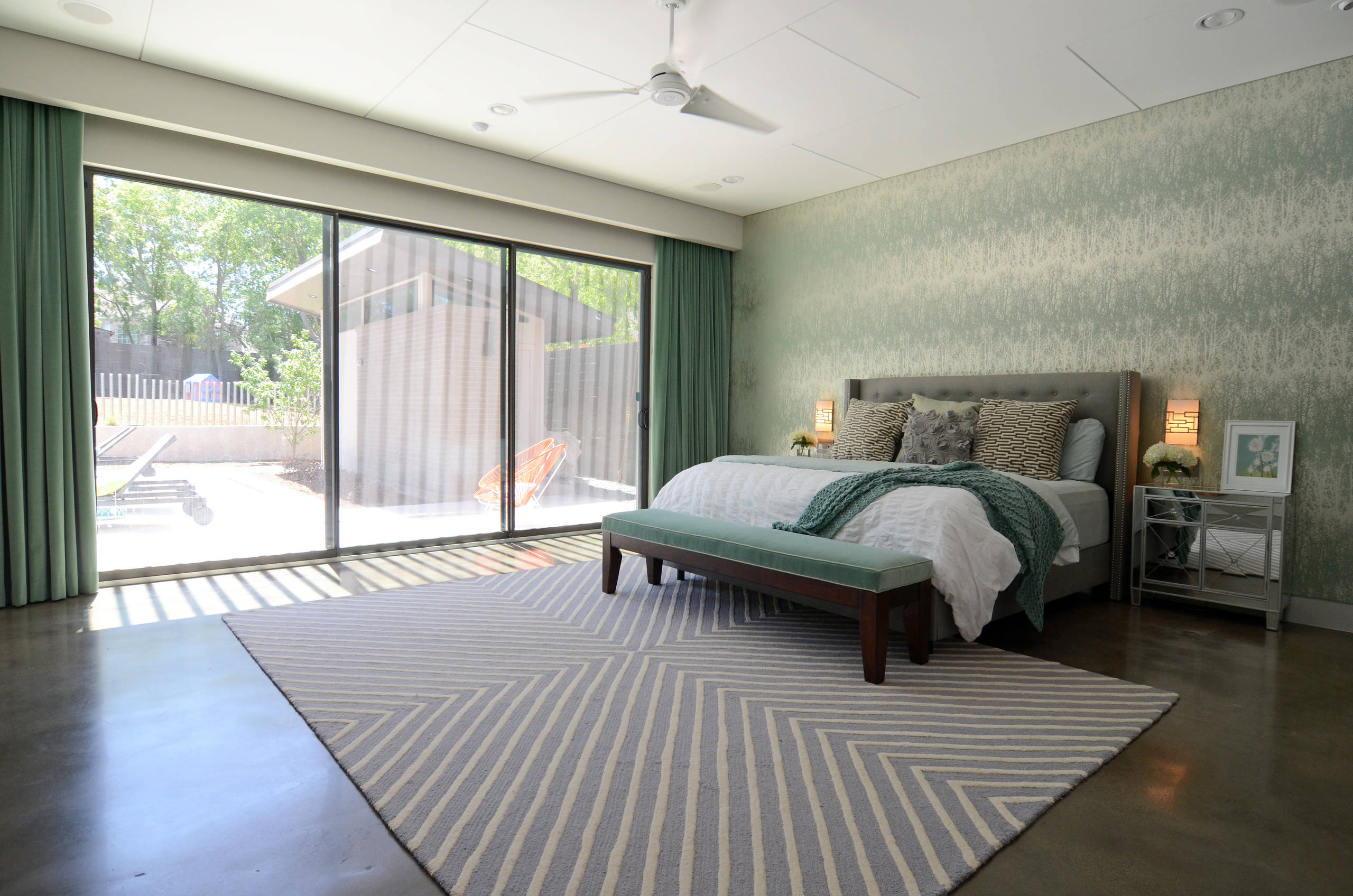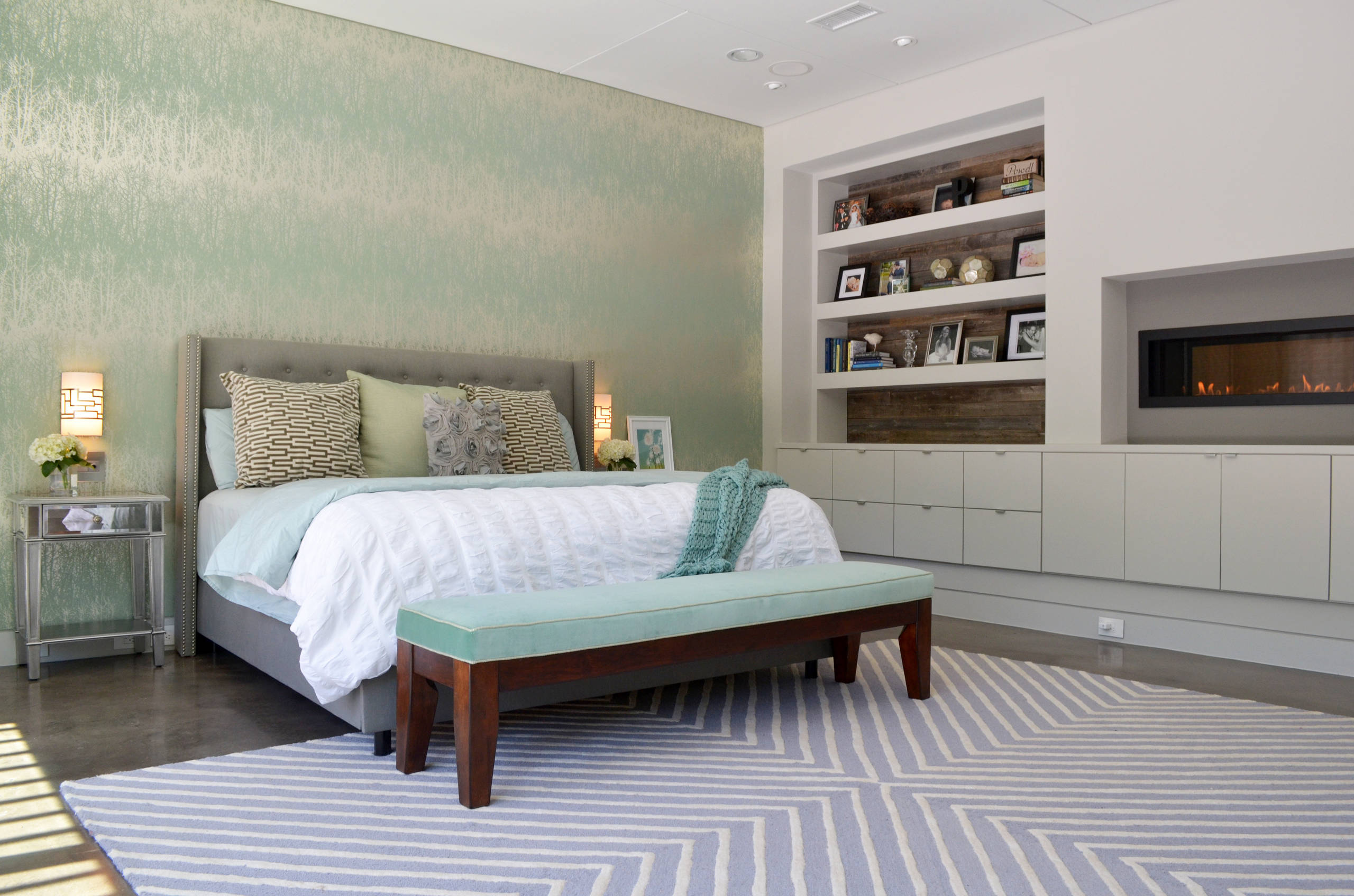 The master bedroom is a serene mix of mint, white and gray. A two-sided fireplace is set into a storage wall that divides the master suite and bathroom.