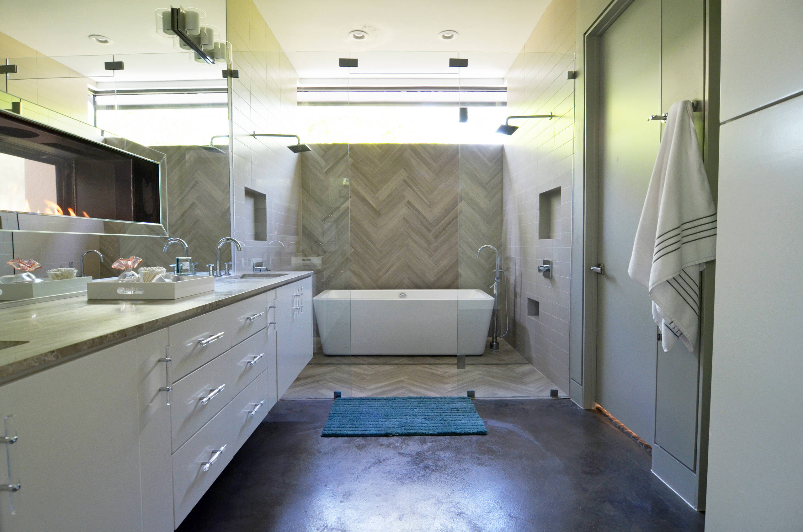 The floating fireplace is framed by the bathroom mirror. “Scott’s design turned out beautifully,” says Melissa. “When I’m dressing in the bathroom, I can see through the fireplace, out the windows and into the backyard where the kids are playing.”