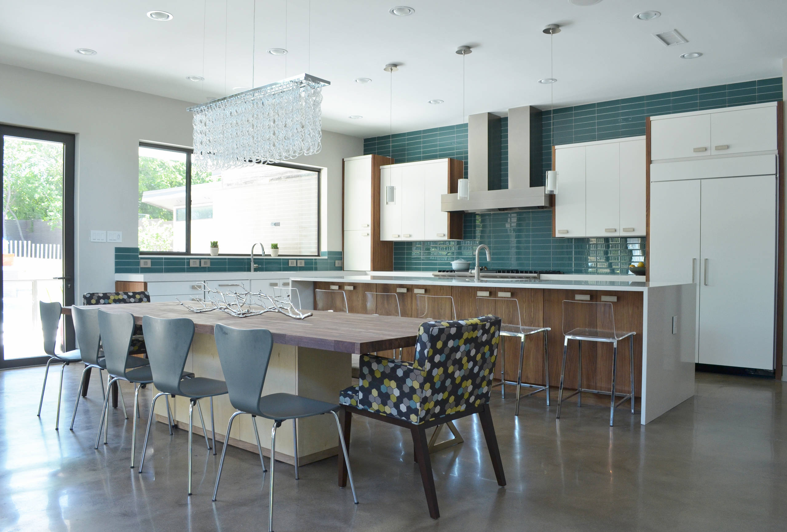 Dining chairs: Room & Board; armchair: Mitchell Gold + Bob Williams; chandelier: Large Glass Chain Island, Shades of Light; stove: Viking 60-Inch Range; refrigerator: KitchenAid