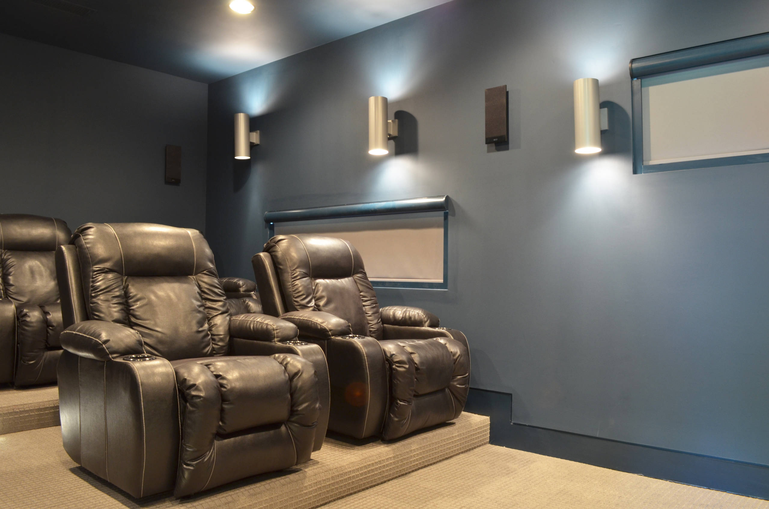 The family enjoys watching movies together, so a media room was included in their design. Luxurious lounge chairs are situated in front of a large screen. This room lies just off the upstairs hallway.