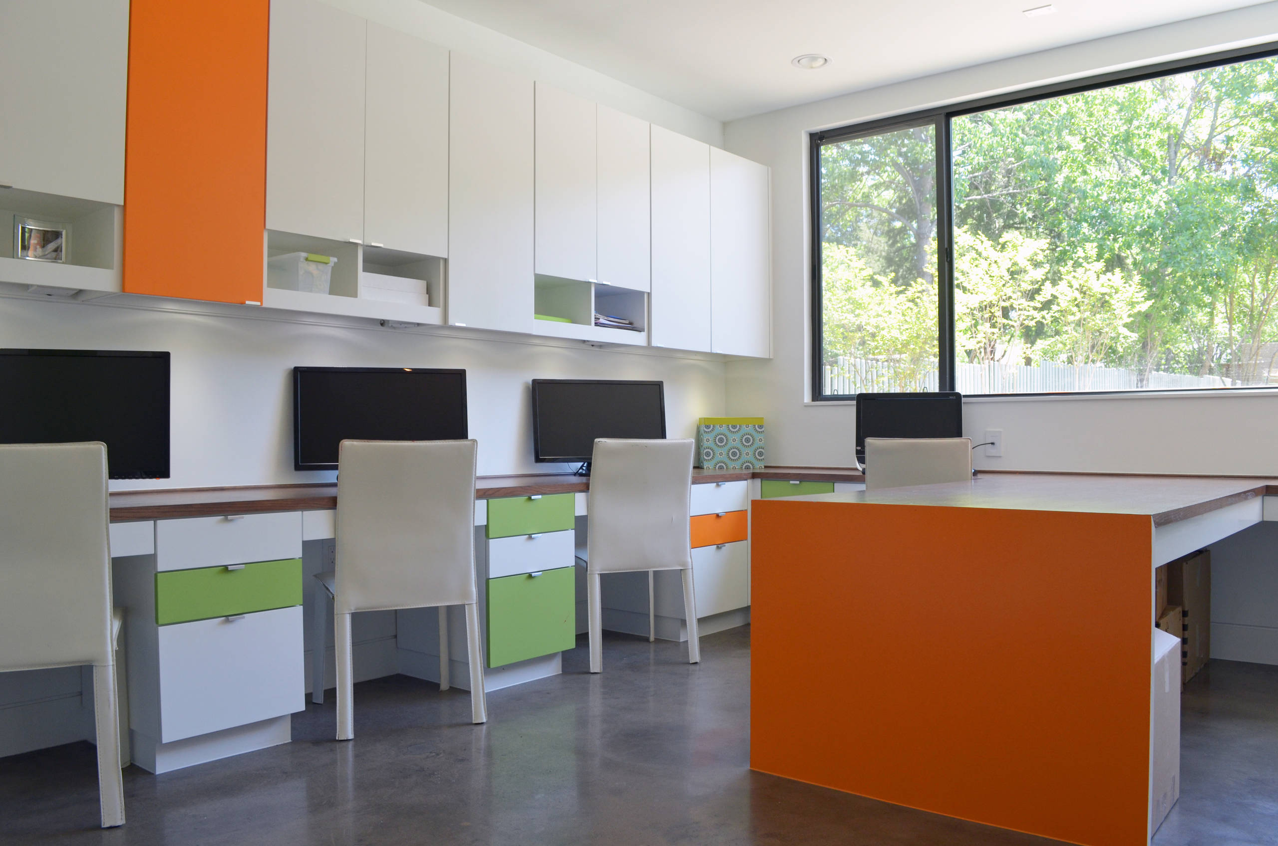 The couple loved the idea of creating a place for the family to be together for homework, studying and crafting. The family office lies just off the living room and has views of the backyard.
