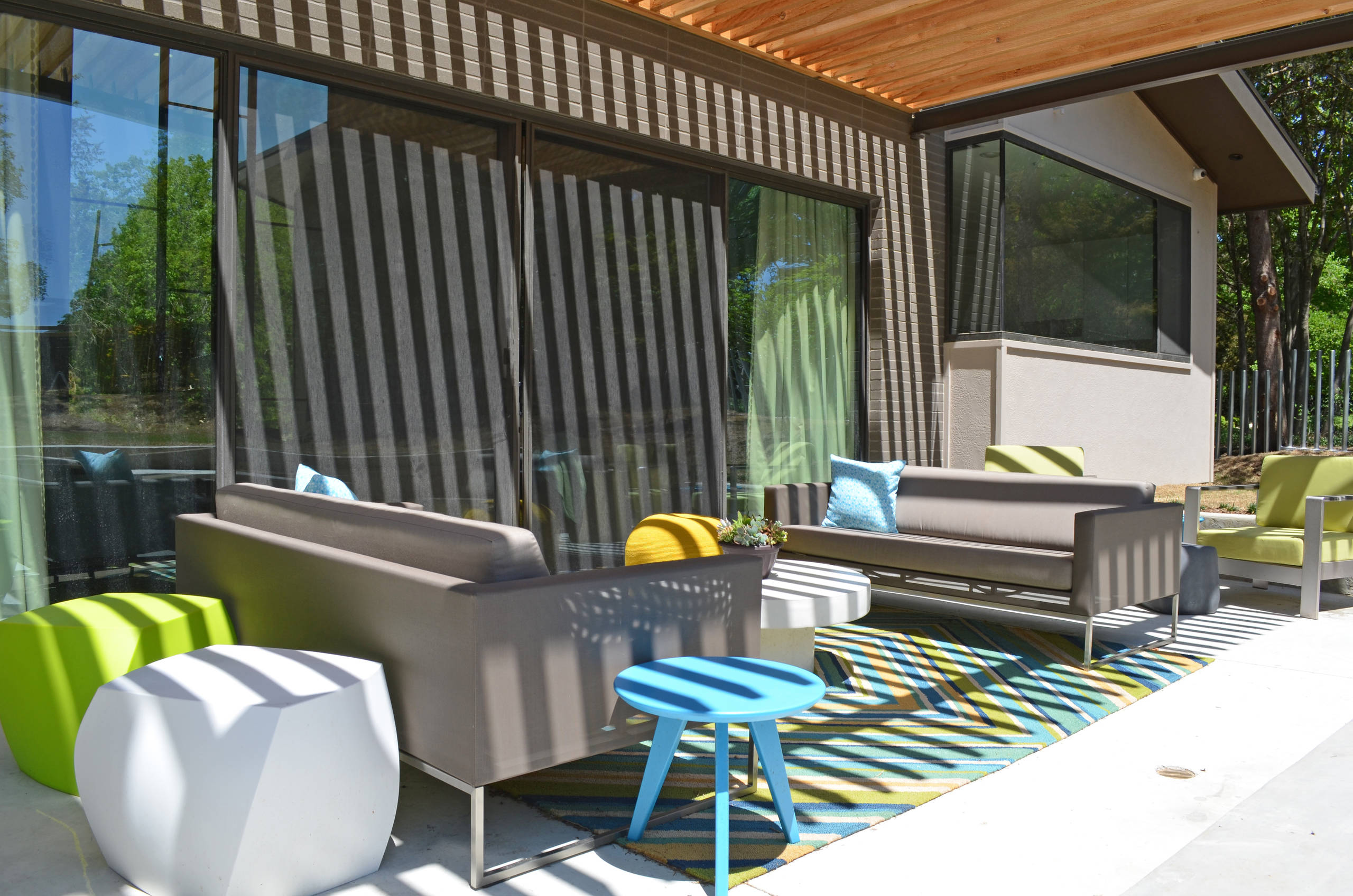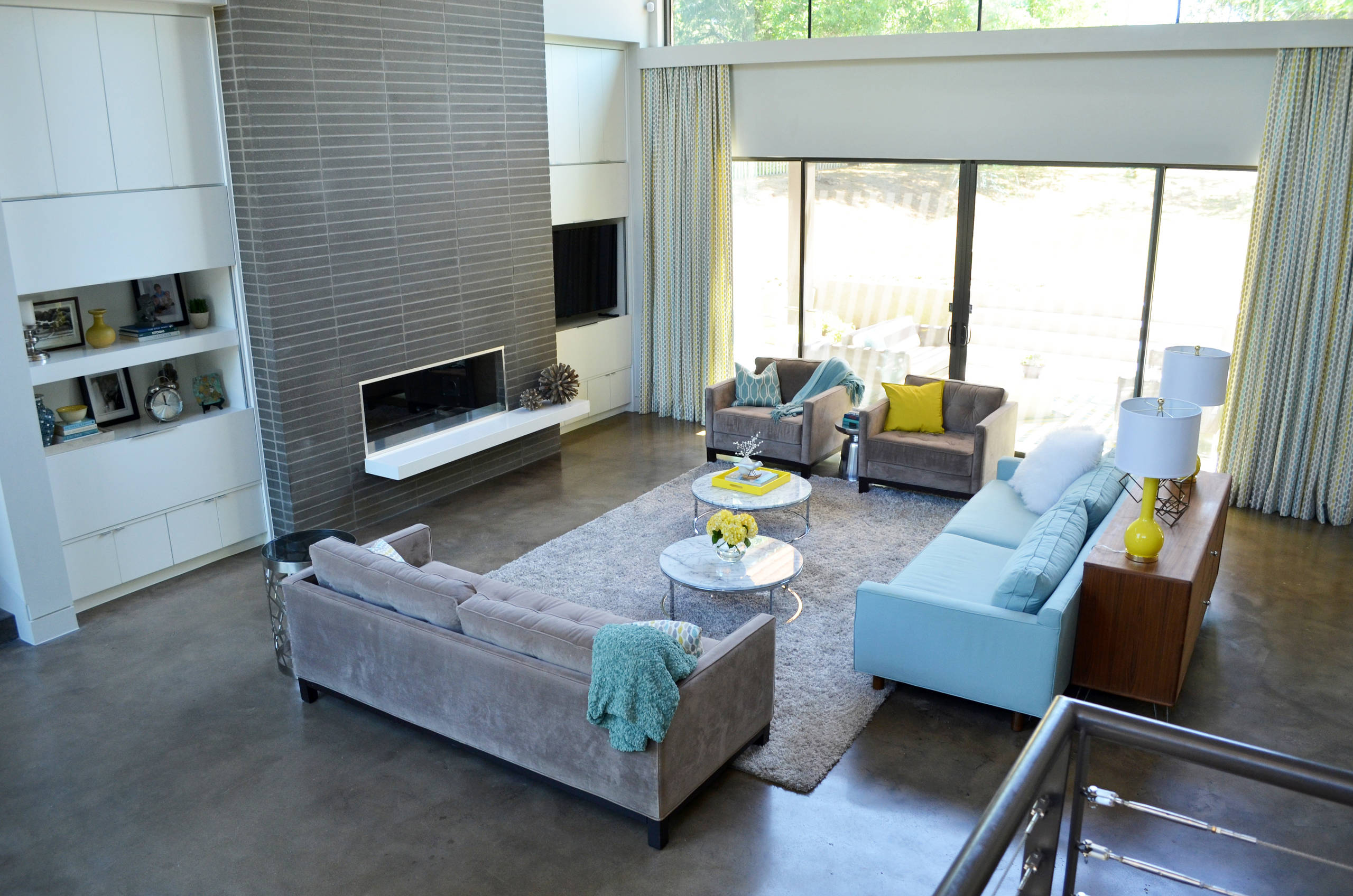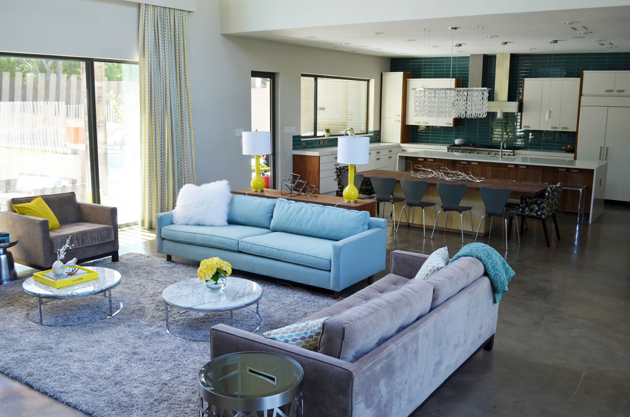 Natural elements and a brushed concrete floor are paired with modern furnishings and cheery pops of aqua and yellow.