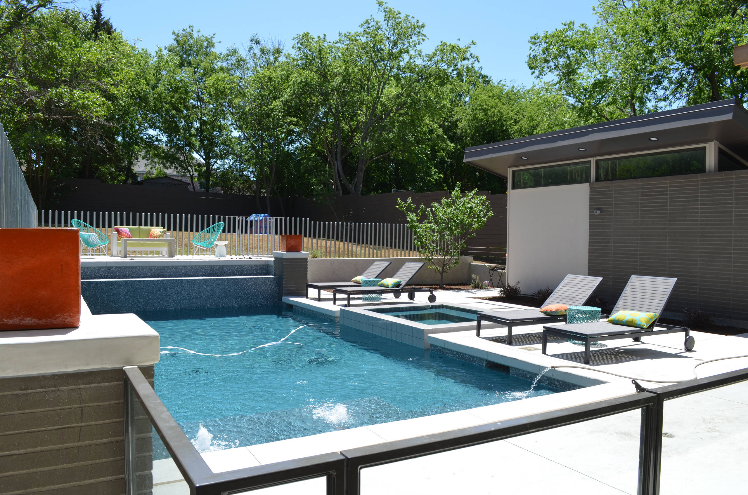 The backyard pool and spa are surrounded by a low glass wall for the children’s safety. Lounge chairs and a pool house make the space especially inviting. A grassy area lies beyond the pool for free-range play. The family is building a play fort in the upper corner of the property.