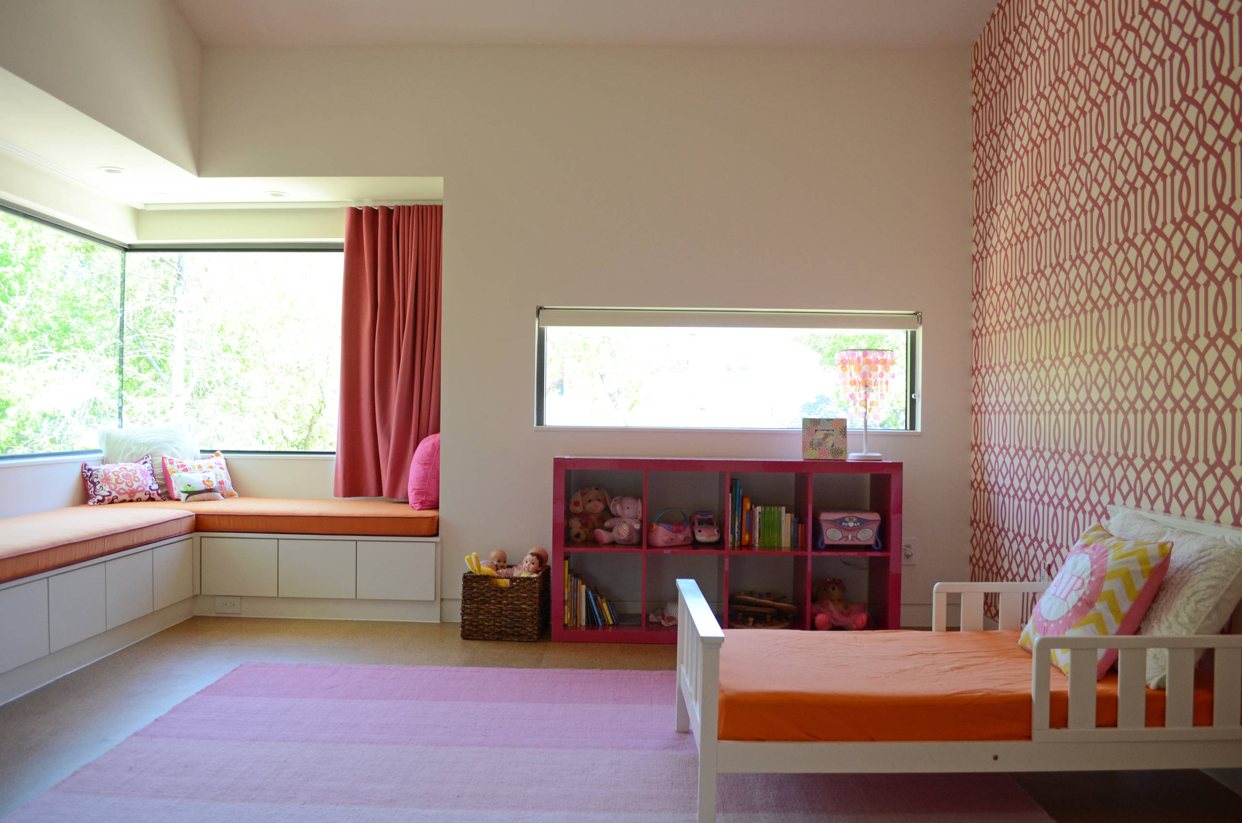 Avery’s room mirrors her little sister’s. Hot pink and orange crush make up the bright color palette. A built-in window seat boasts incredible views of the front of the property.