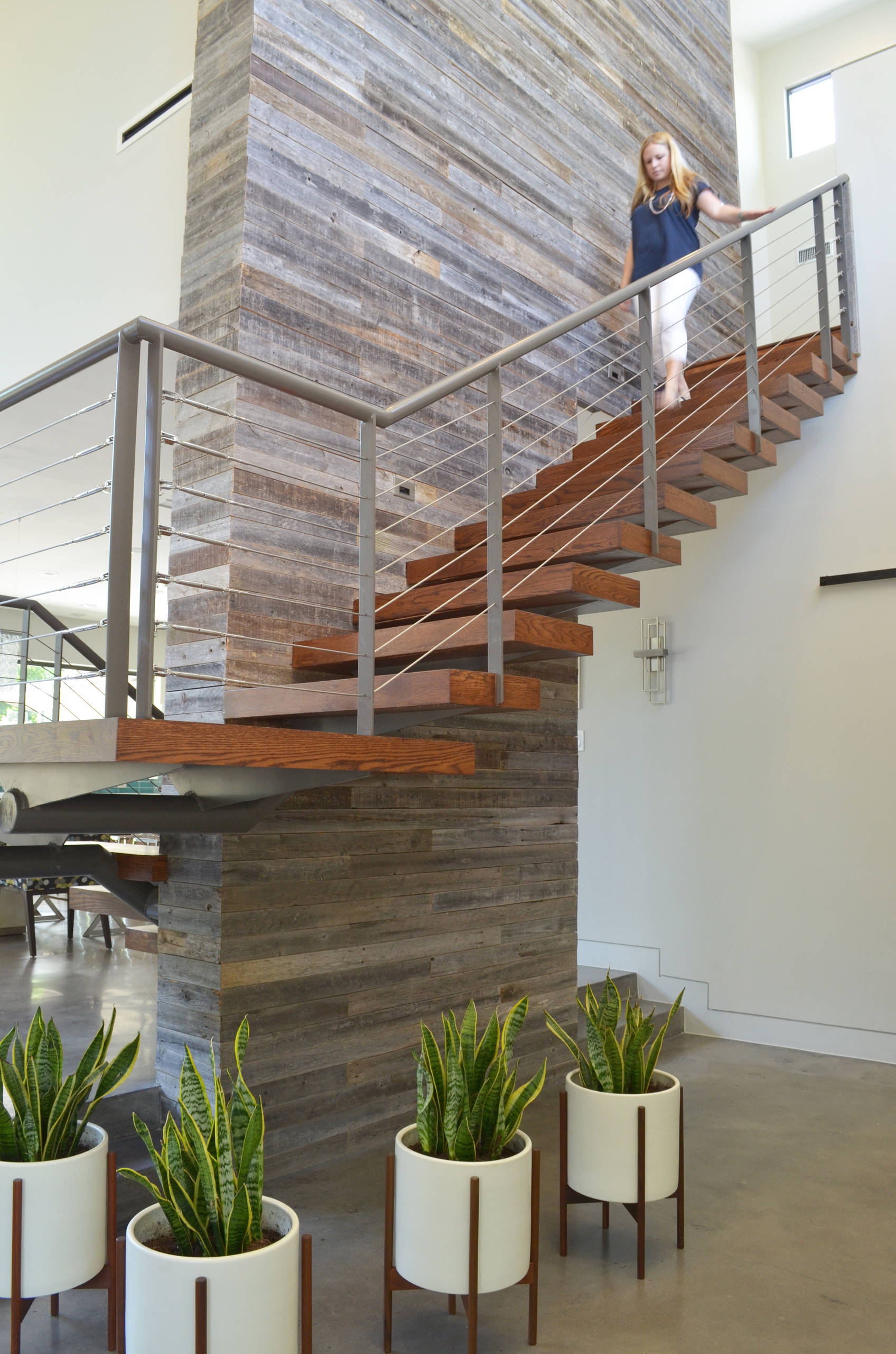 The wooded lot set the tone for the house. The vaulted foyer includes a soaring walnut staircase and clerestory windows that provide a view of the surrounding treetops. The stair railing was specially engineered and fabricated from steel and took about four months to build.