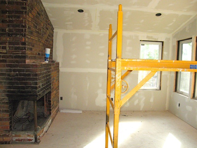 BEFORE: The original living room fireplace was a looming mass of darkened brick that added visual weight to the room.