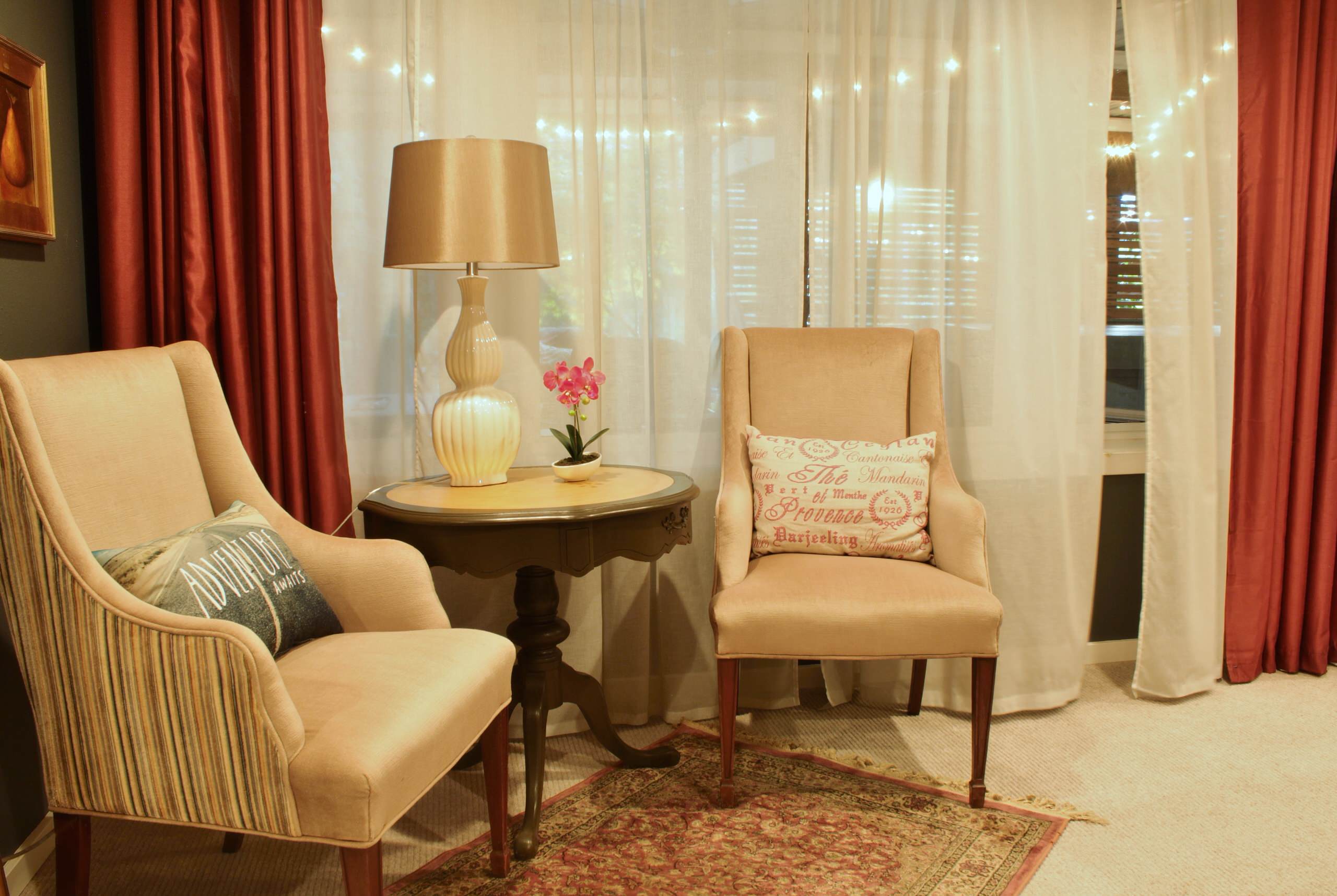 The master bedroom is large enough to accommodate a comfortable seating area with windows that look directly out on the back patio. The outdoor lights seen through the curtains add twinkly charm to the space.