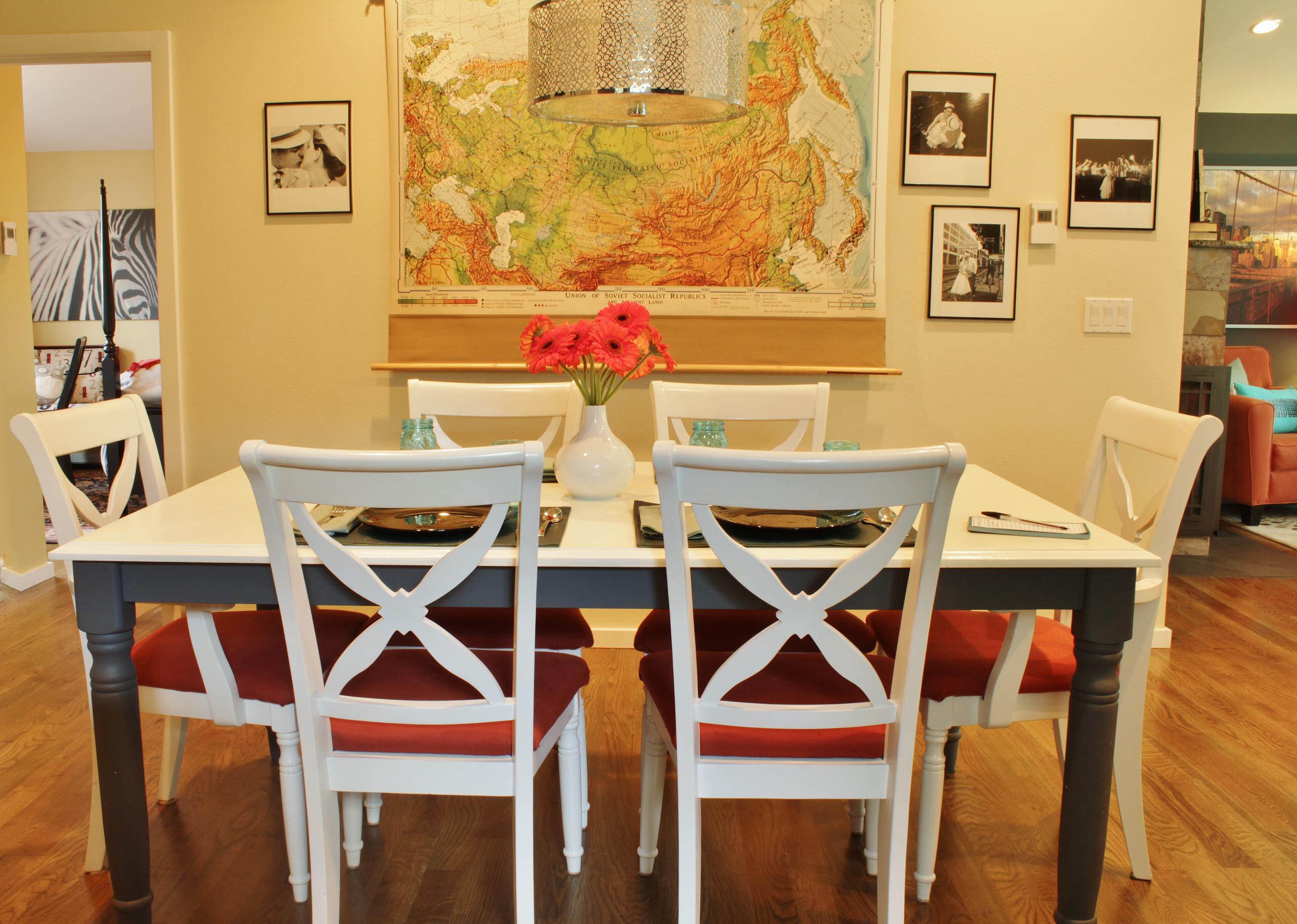 A drum pendant from Lowe’s combined with a repurposed table painted by West create a cheery dining area. “I’d describe our style as global, eclectic and contemporary,” West says. “It’s not traditional because it’s more clean-lined. There are no rolled arms here.”