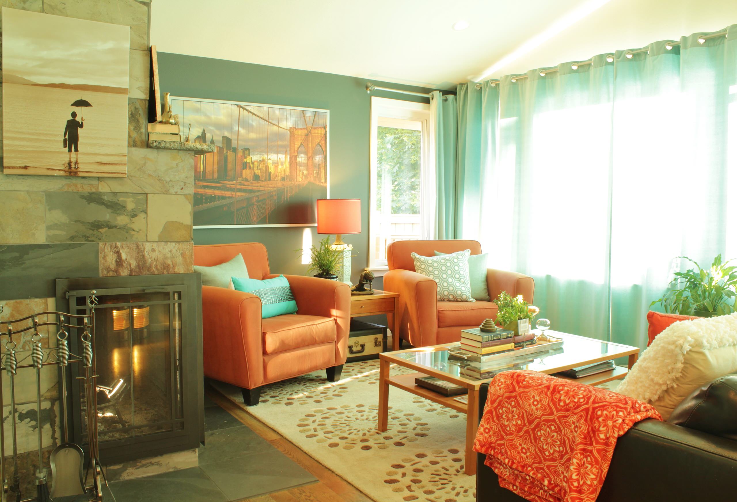 AFTER: The couple replaced the original fireplace with a custom corner one that spreads its heat and light both to the living room and to the dining and kitchen areas. The living room’s orange, brown and aqua palette is a nod to the home’s vintage roots while staying solidly in the 21st century with its contemporary line and form.