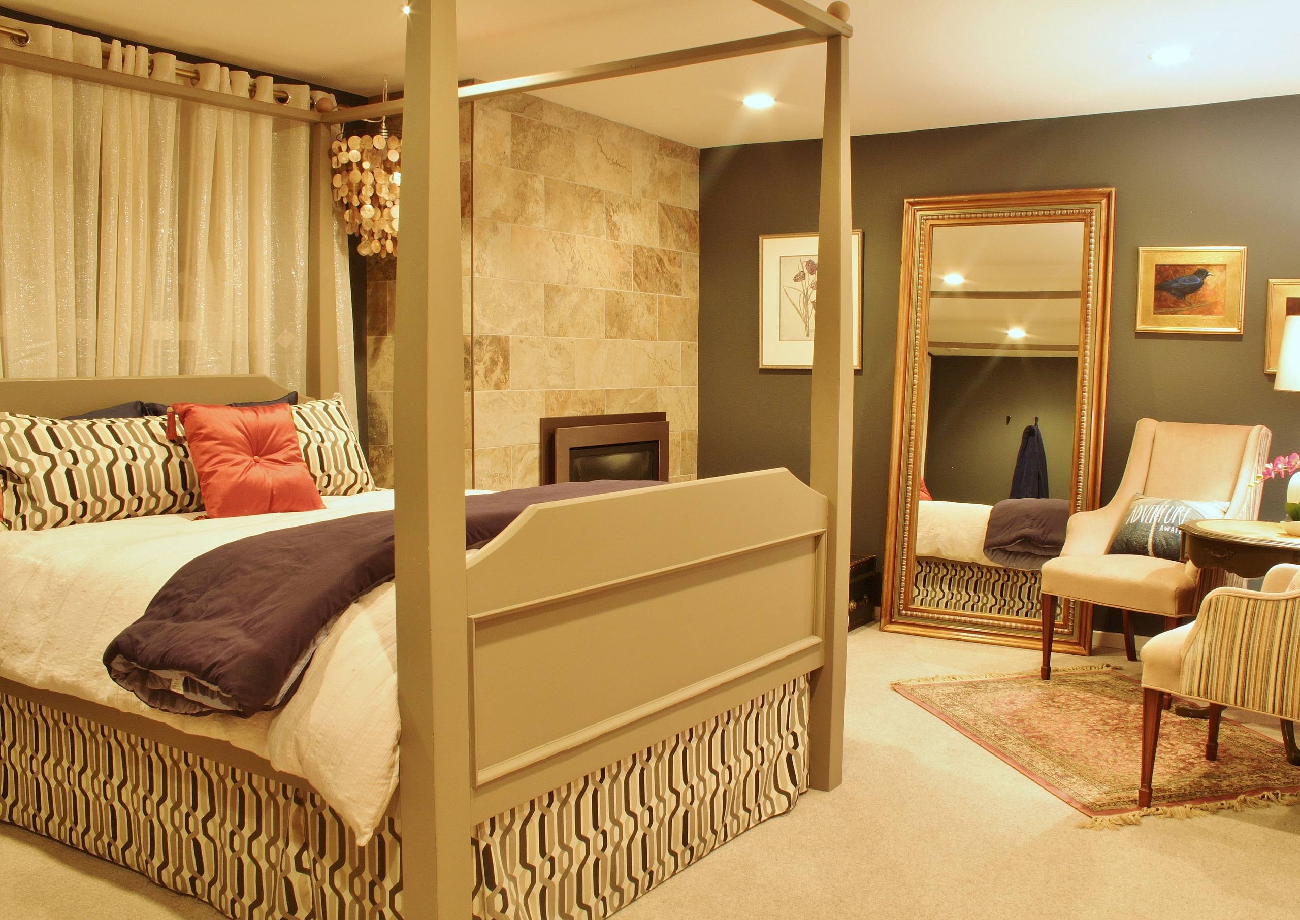 AFTER: The couple elected to keep the fireplace and embrace the room’s inherent coziness with dark, warm accent walls and relaxing neutrals. “It helps that this room has high ceilings,” West says. The ceiling height allows for a canopy bed, an oversize mirror, and a sense of gracious space and light. The once-brick fireplace is now faced with clean-lined contemporary stone.