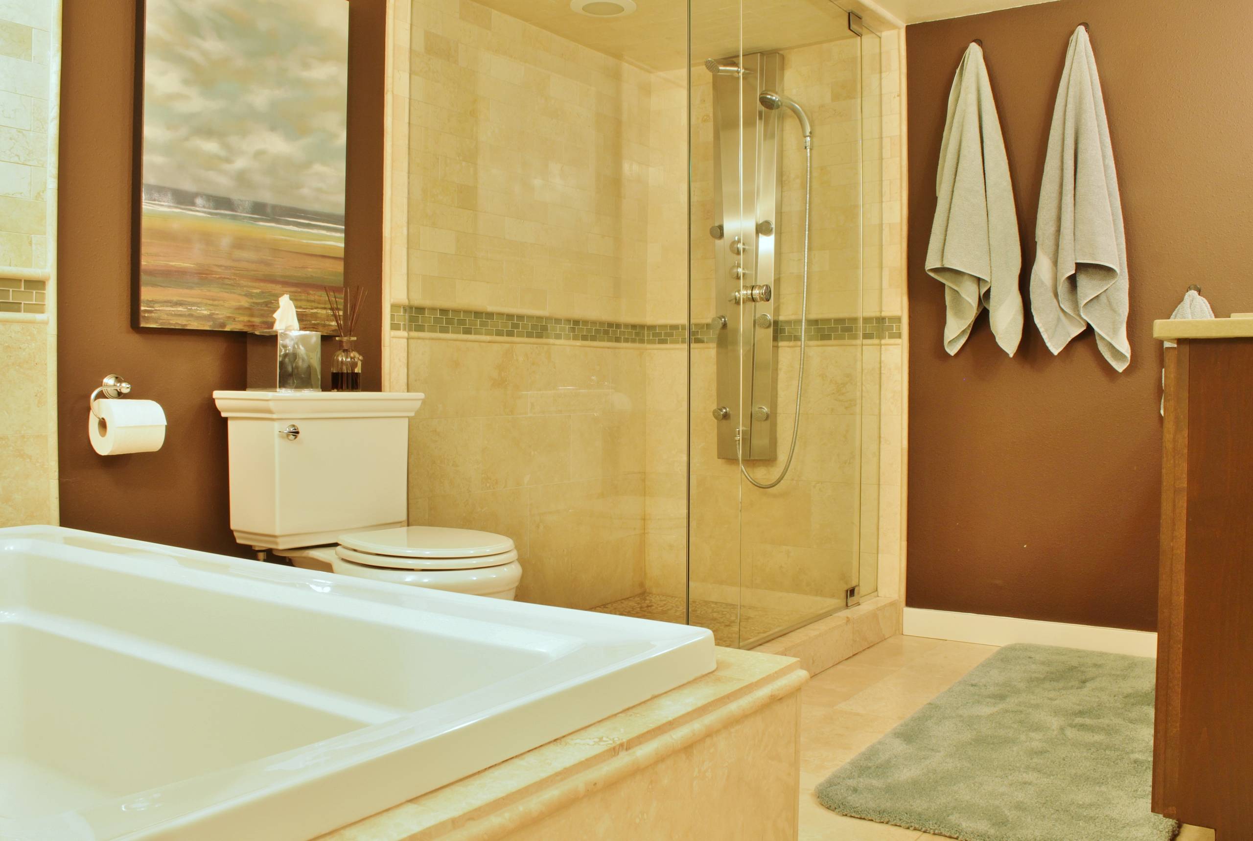Creamy stone tile, cocoa-colored walls and artwork create a peaceful, spa-like feel in the spacious master bathroom.