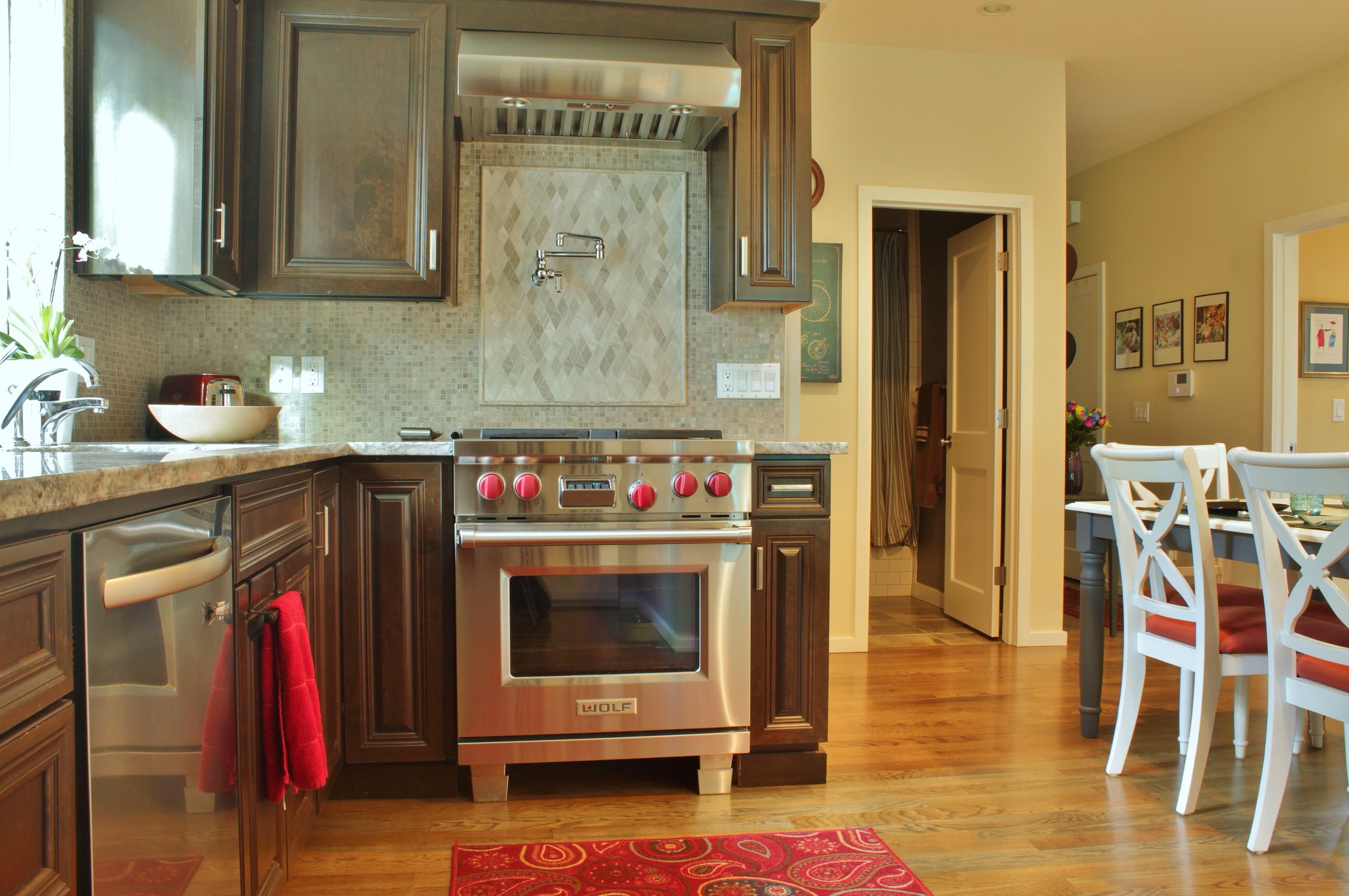 The compact L-shaped kitchen is tucked out of the way, and features a Wolf gas range, granite slab counters, a tile backsplash insert and an elevated pot filler.