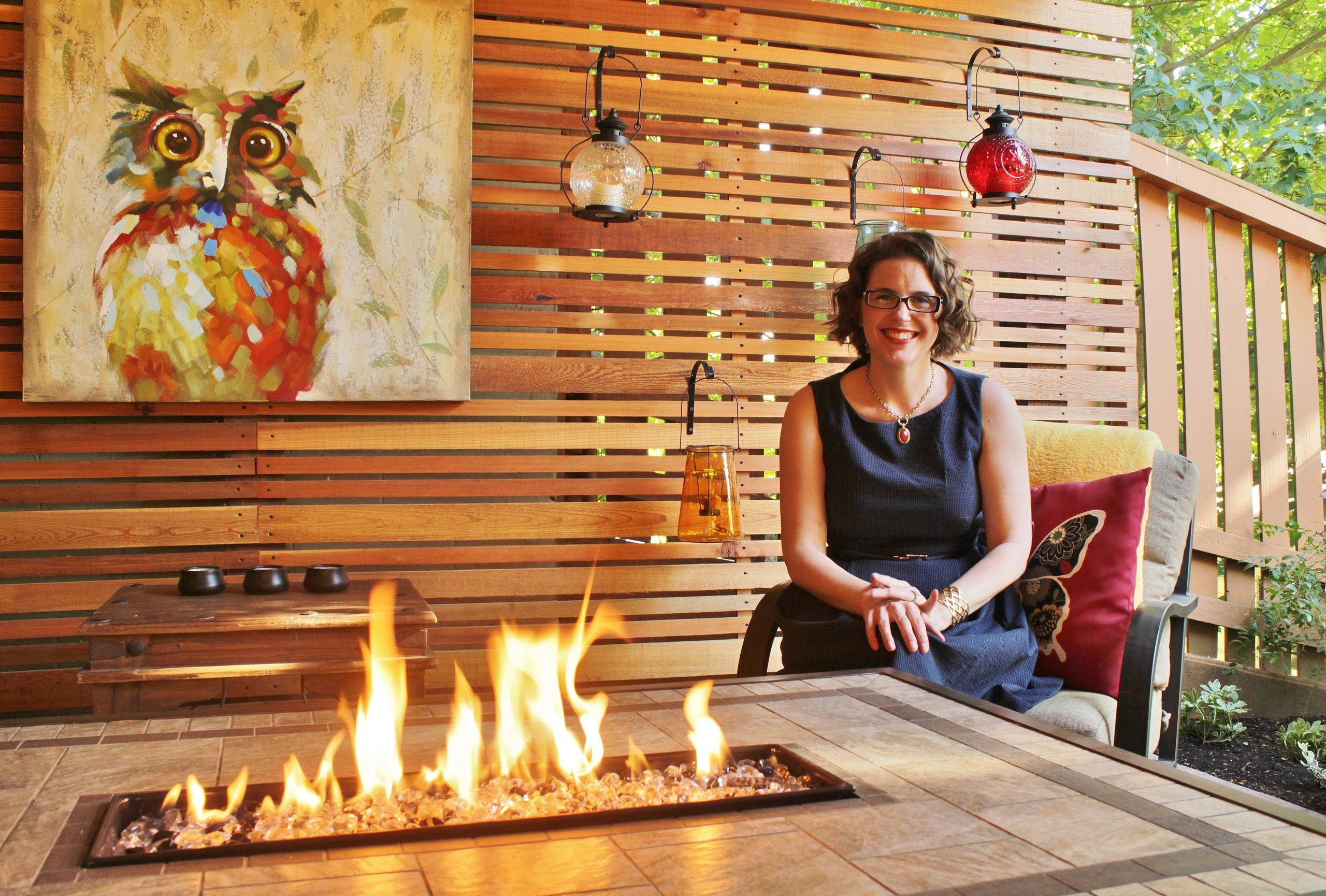 “What I love the most is when my husband comes home and says, ‘This is a nice house,’” says West, seen here relaxing on the new patio. “So many times a house doesn’t reflect both people; there’s someone who’s not comfortable in it. So when my husband says that, it just means the world to me.”