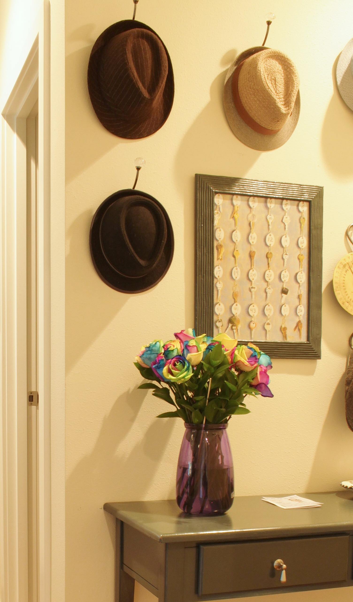 Hanging by the entry are a hat collection and a painting of hotel keys by West’s mother, Terry Rafferty.