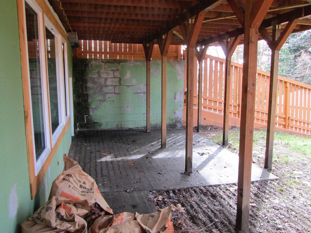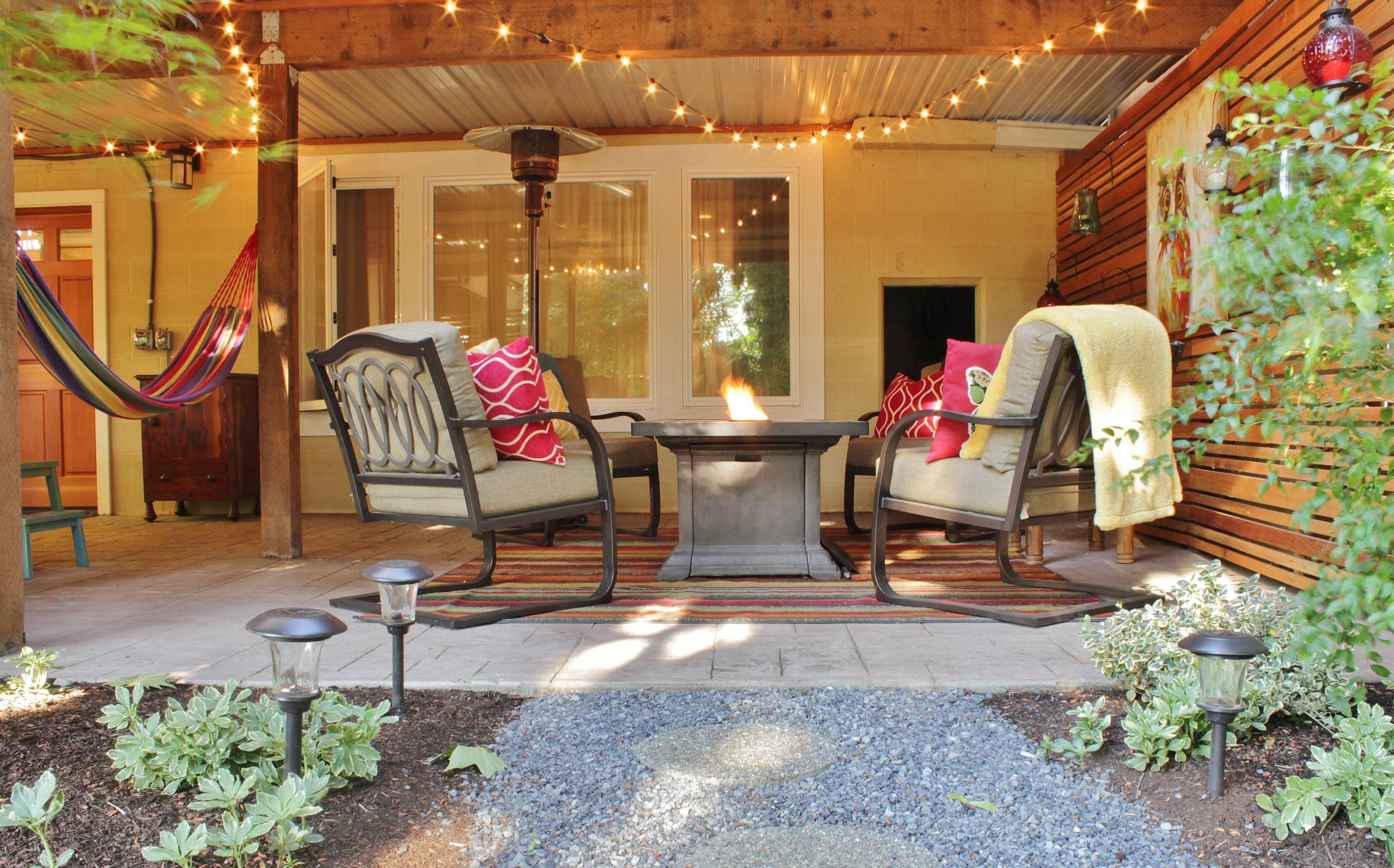 AFTER: The back master bedroom door leads directly onto the new backyard patio, complete with hot tub, hammock, fire pit, heat lamp and comfortable seating.