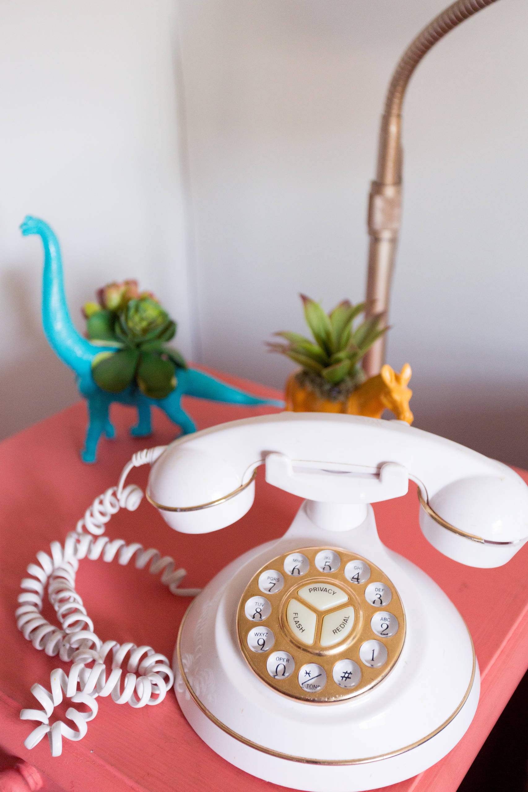 The pink table was a nightstand she painted in Flamingo Chalk Mineral Paint by Dixie Belle. “I love the way the color pops against the new gray carpet and neutral walls,” she says.