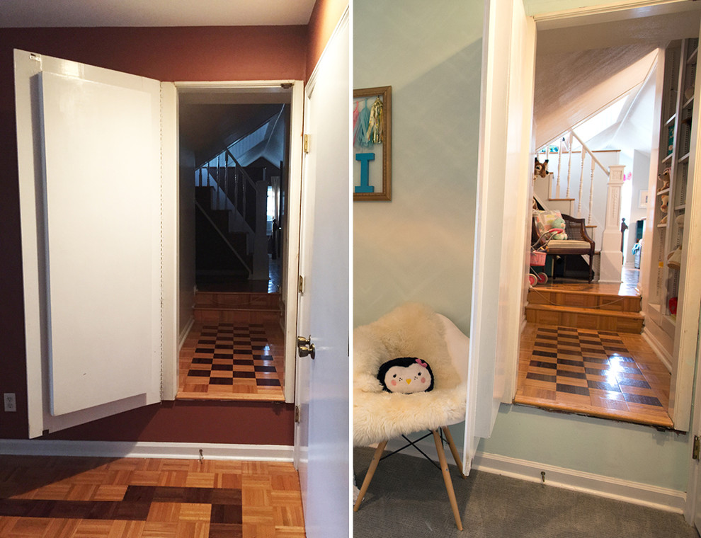 This unusual door to the attic playroom was a feature the previous homeowners installed. “I love the 1970s shelf of books that is actually a secret passageway to the attic playroom,” Audrey says. The door opens easily; it is usually kept shut so the warm attic air stays out of the upper level of the house.