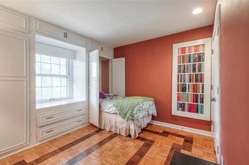 Before: The bedroom featured original parquet floors, but the couple added pet-friendly carpet for their two dogs. They also repainted the walls in a more soothing blue.