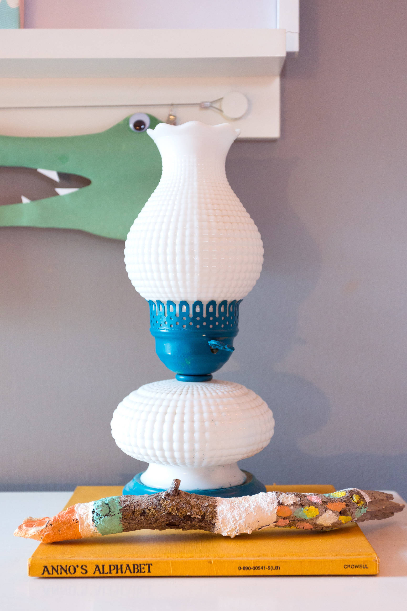 This yellow book is from Audrey’s mother. “I mostly like the color and size,” she says. Audrey found the stick in the backyard and painted it with Vivi, and the lamp came from Audrey’s great-grandmother.