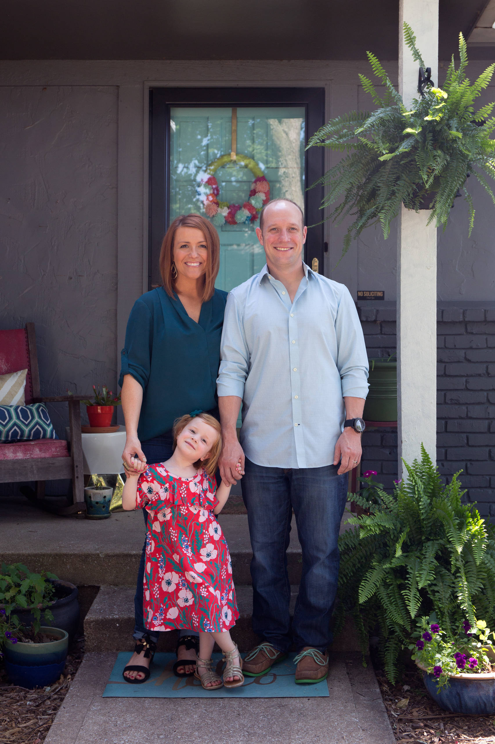 Audrey and Ted are shown in front of their 1972 fixer-upper home with Vivi. “I love the tall trees in our neighborhood and the character of each home,” Audrey says.