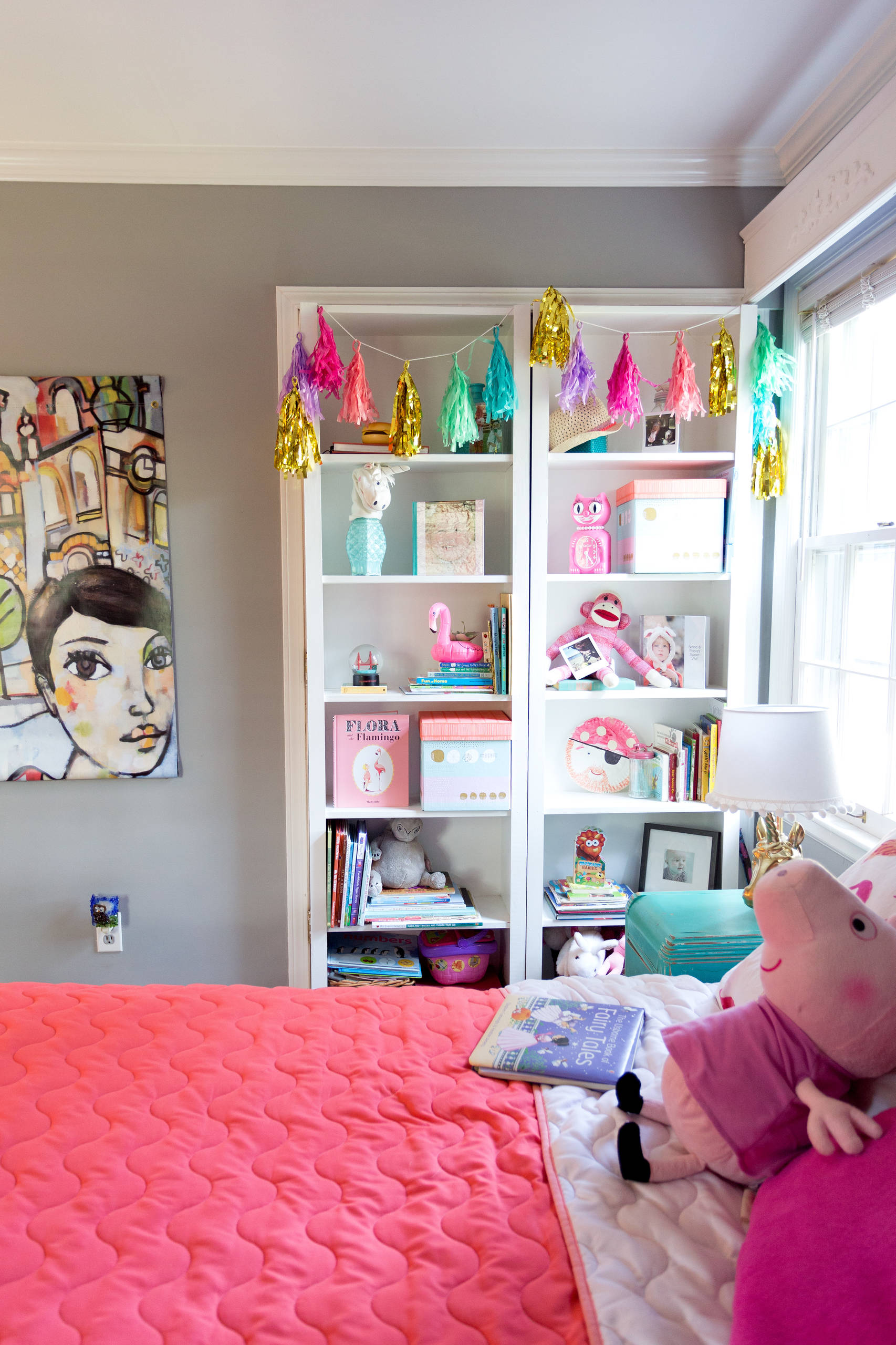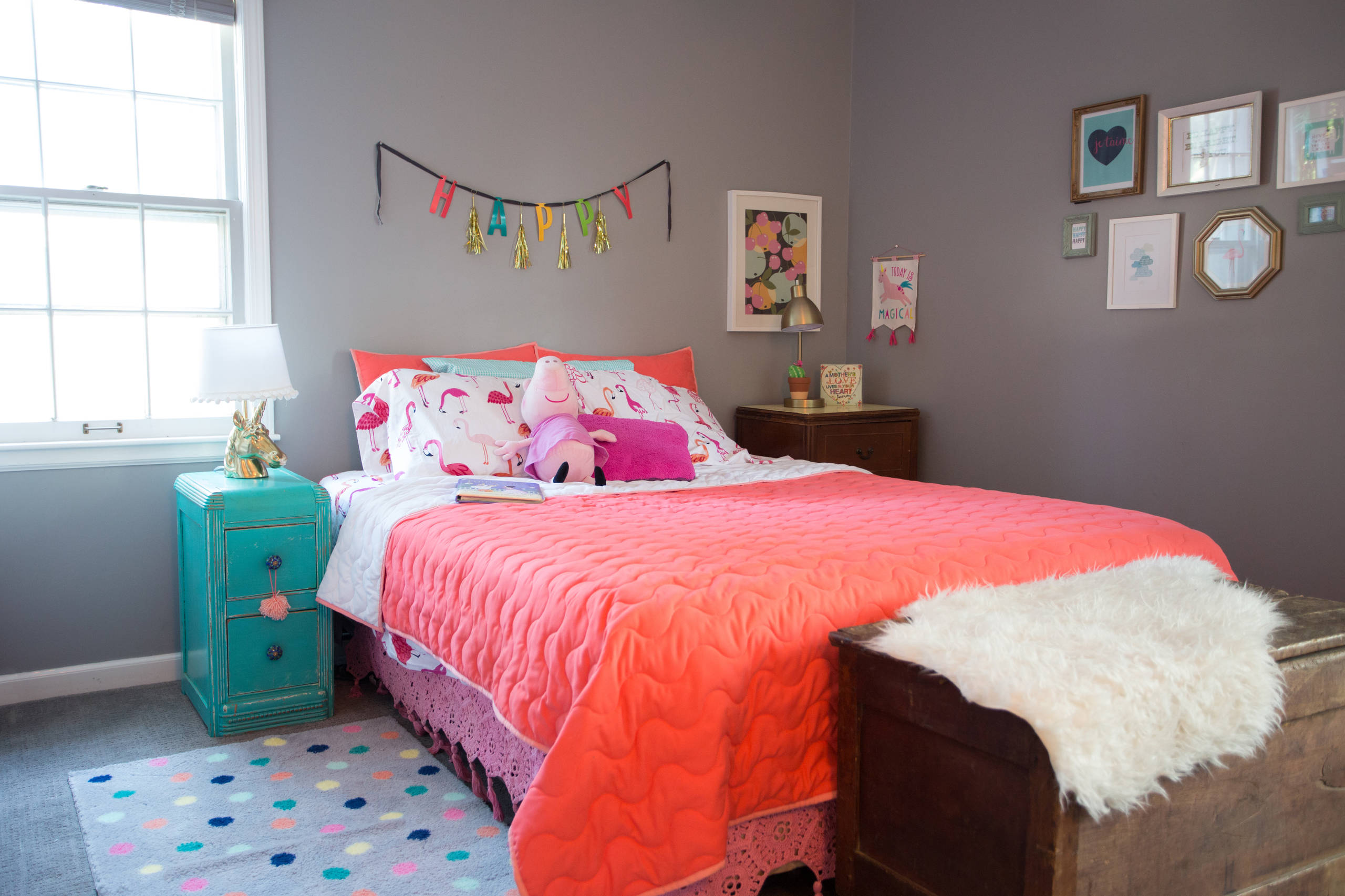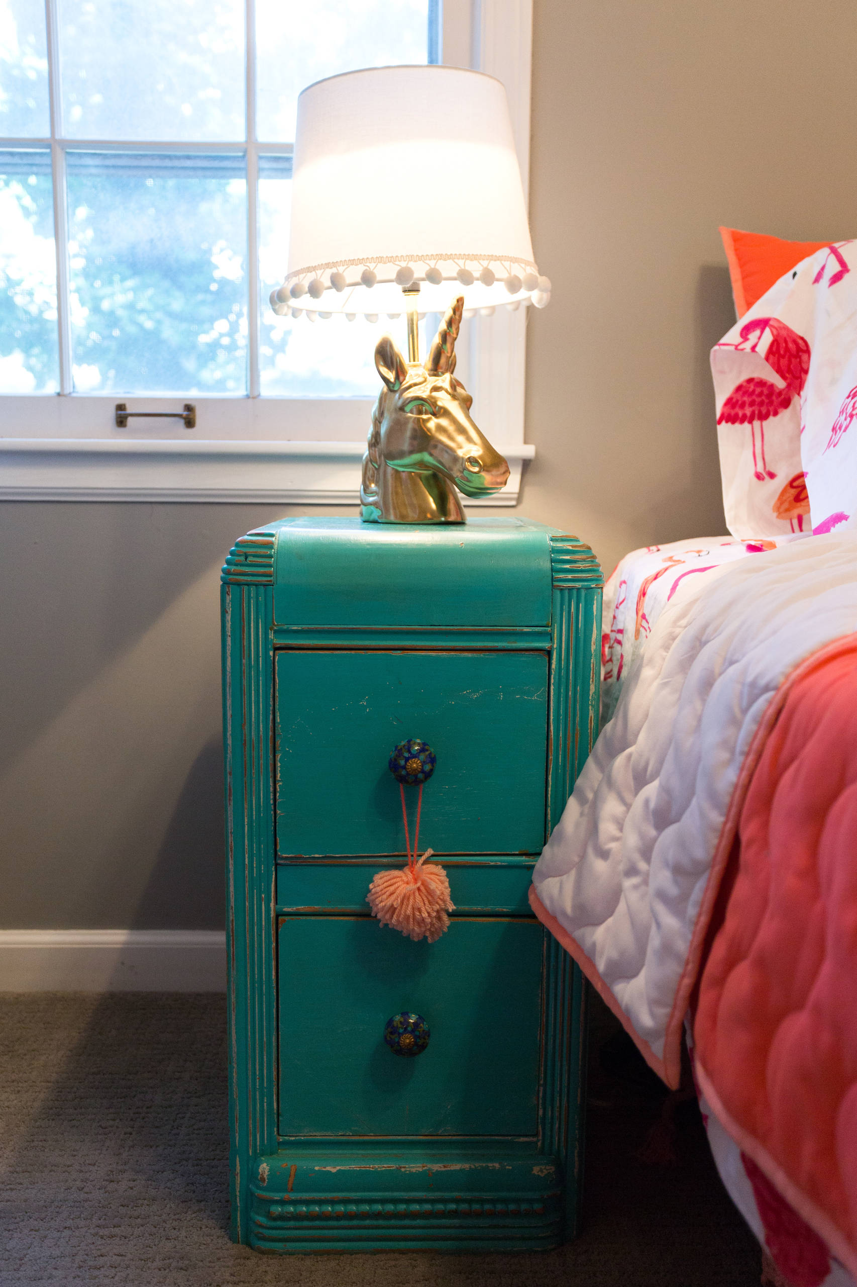 A cheeky unicorn lamp sits on top of a turquoise nightstand from the vintage shop Good Ju Ju. “My main goal with the spaces was to use items or furniture we had on hand already and not to bring much of anything new into the spaces,” Audrey says. “I love that Vivi knows where the inherited pieces of furniture came from. She can tell you exactly who gave us each piece. They are not very high quality, but they mean a lot to us because we love who they came from. I love how this opens up the dialogue on our family history.”