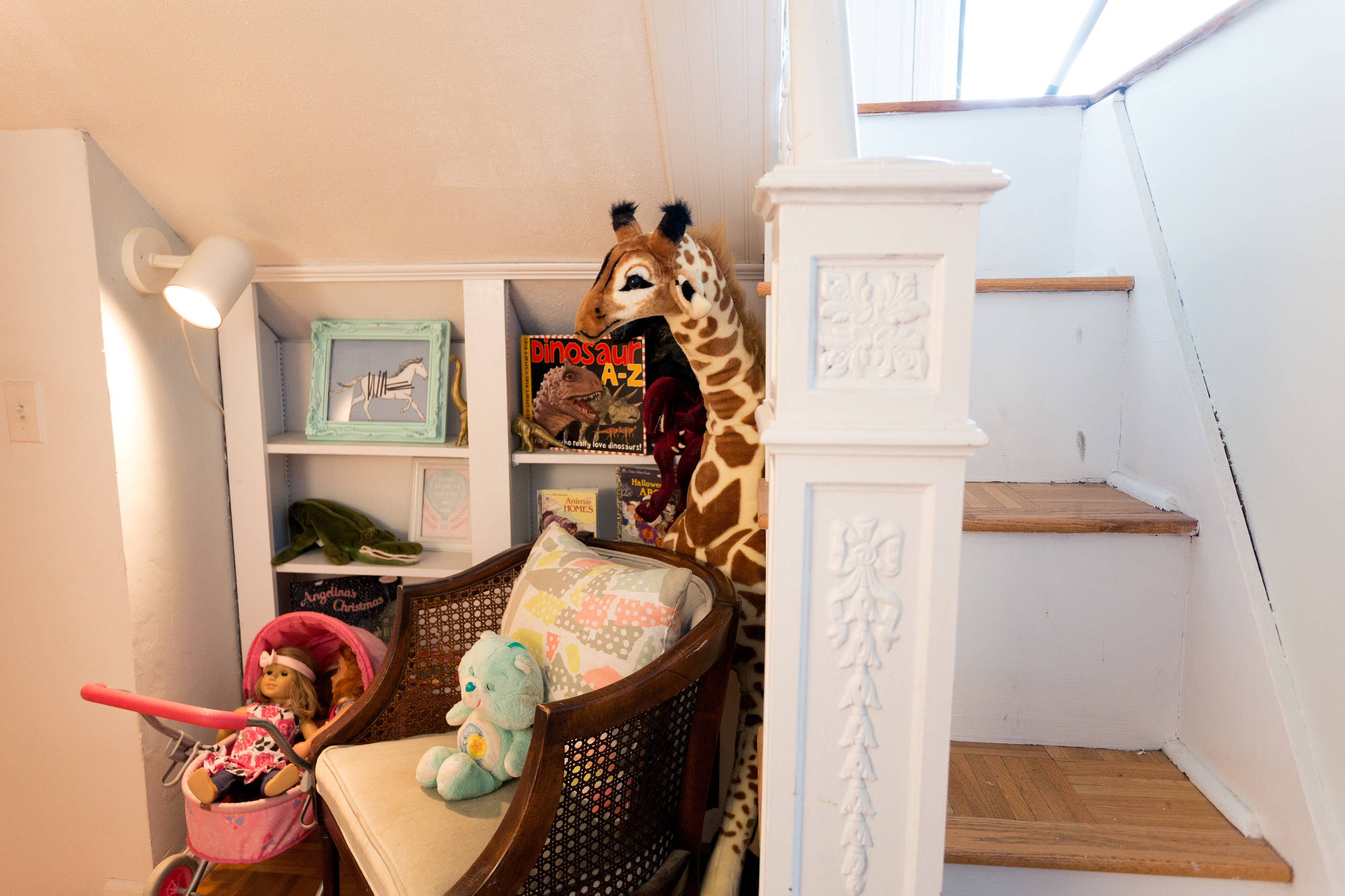 The space includes a little reading nook nestled next to stairs that lead up to the attic observatory. The original architectural detail on the stair banister can be seen.