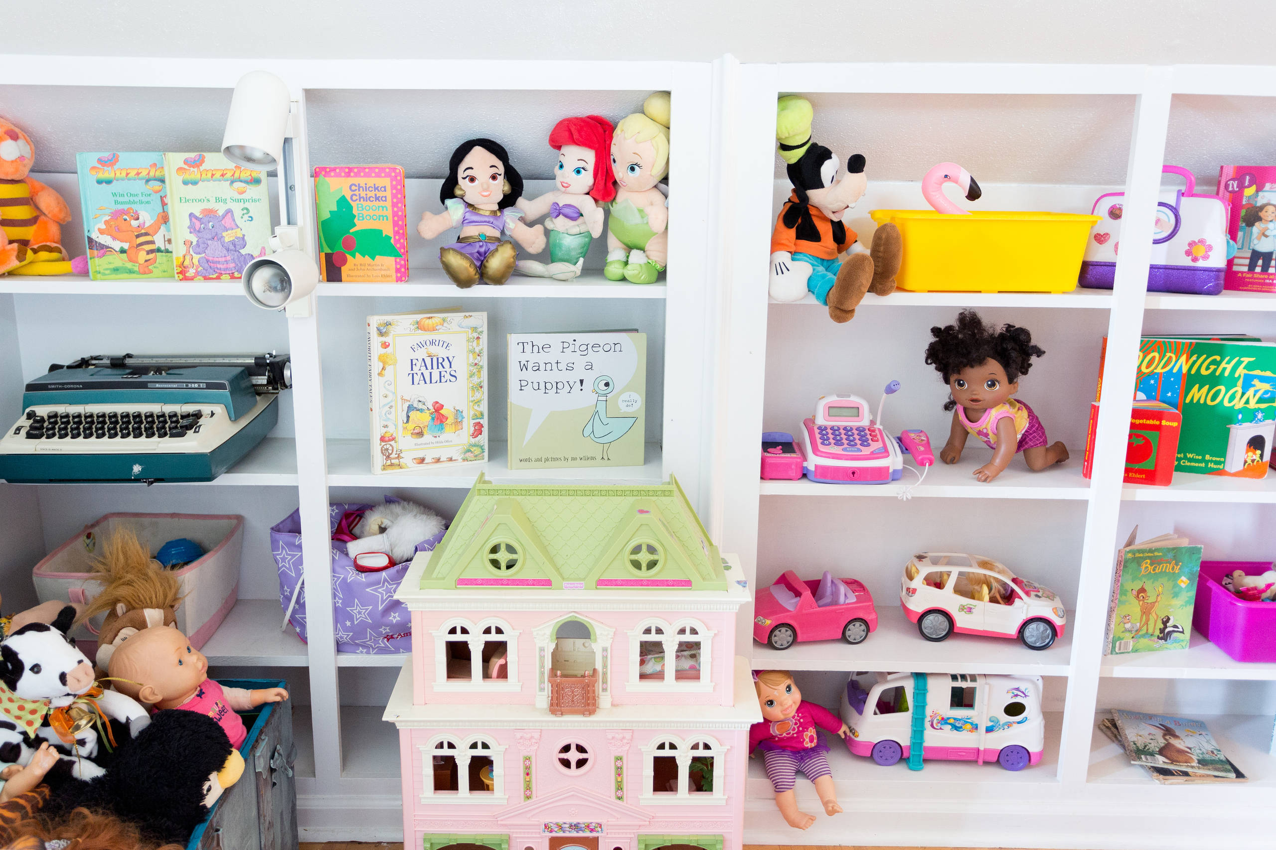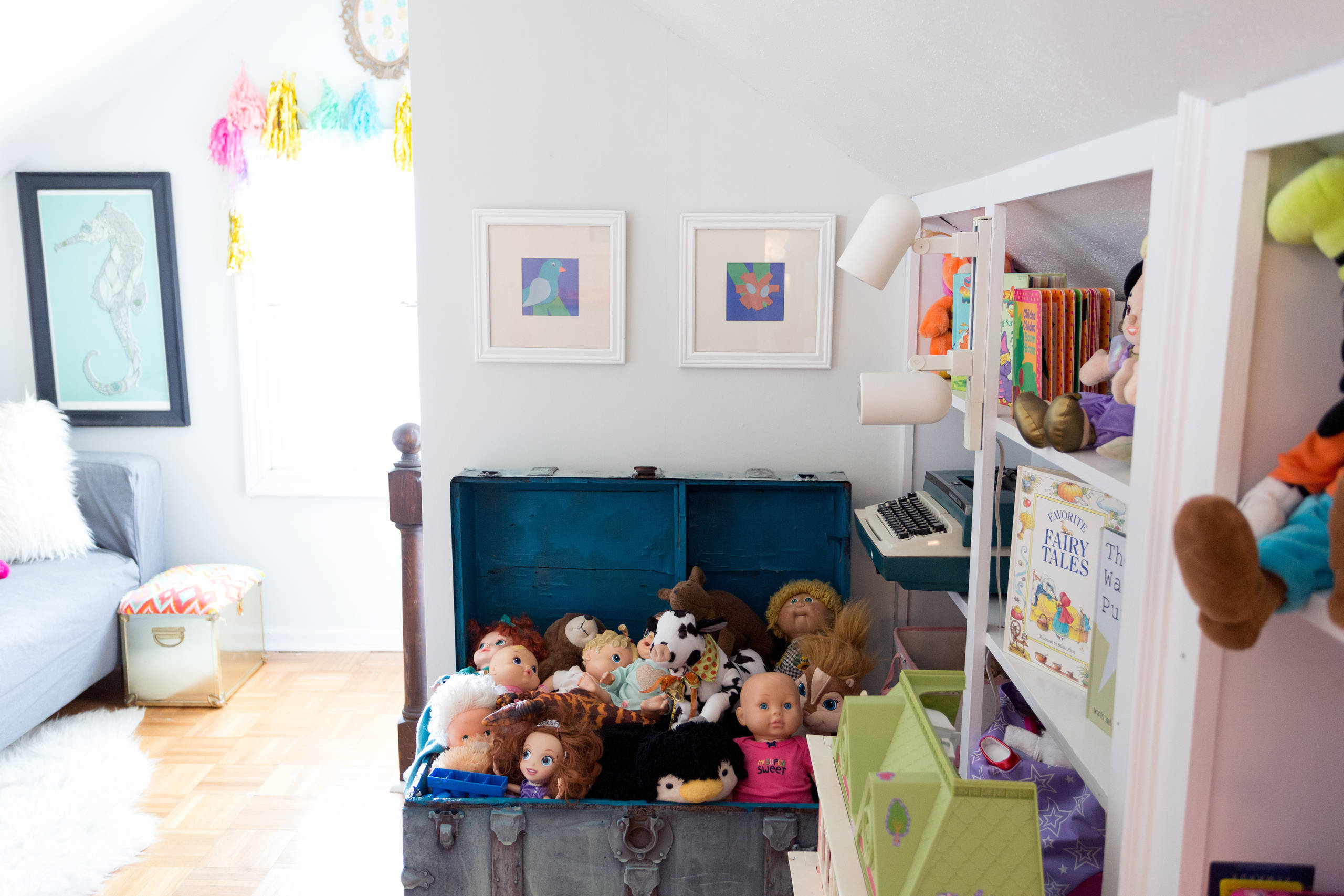 “This room is full of character and Vivi plays in it the most out of all rooms,” Audrey says. The space came with a lot of existing built-in shelving and cabinets. “The shelves are wonderful for displaying and organizing all of the toys that Vivi has inherited from all of her cousins,” she adds.
