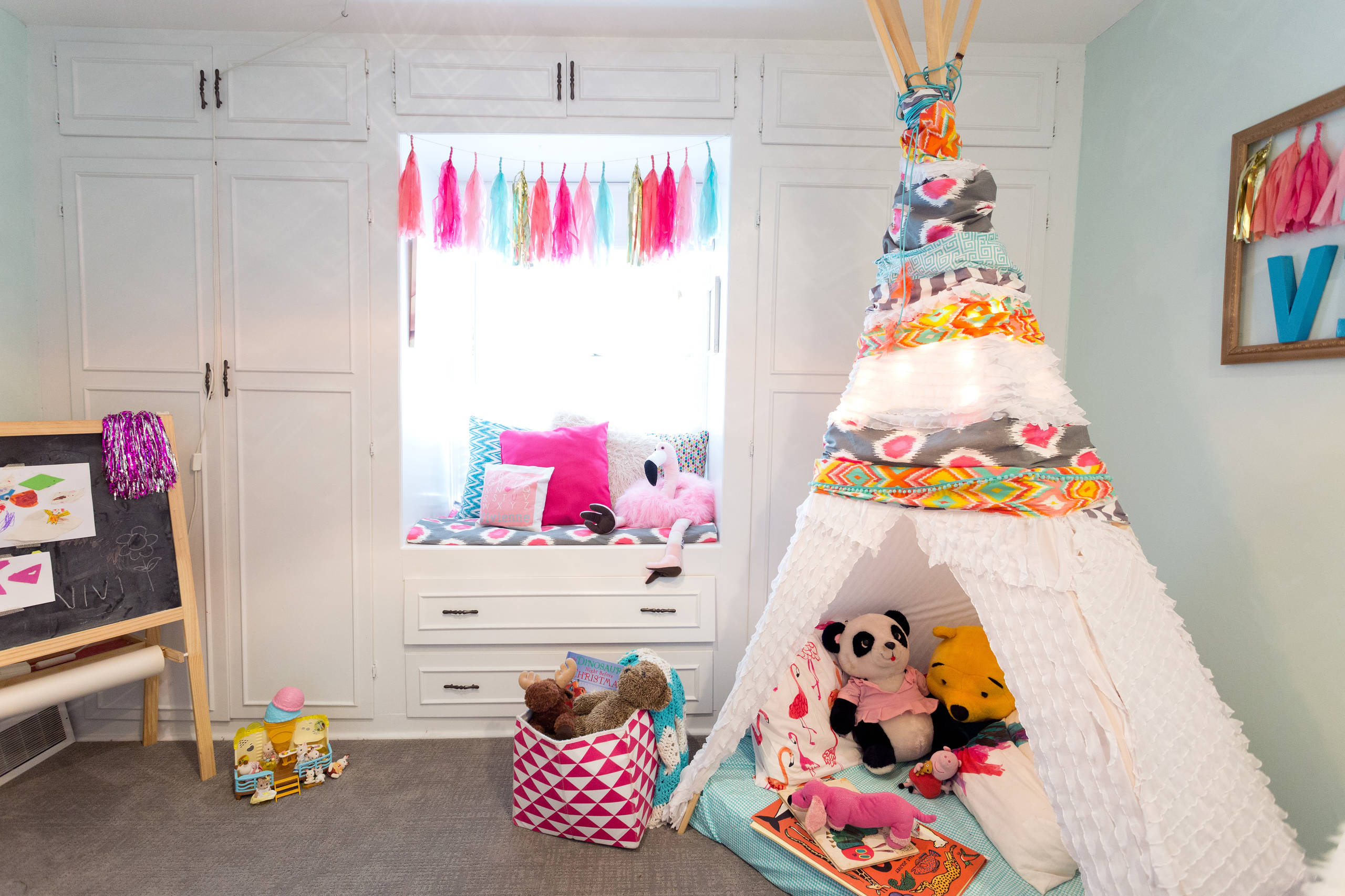 Audrey made this tepee for Vivi as a gift for her first birthday, and it has been one of her daughter’s favorite places ever since. “She loves to read in it and used to sleep in it after the transition from the crib to big-girl bed,” Audrey says. The personalized name art was also a DIY project. The tissue paper garland was purchased on Etsy.