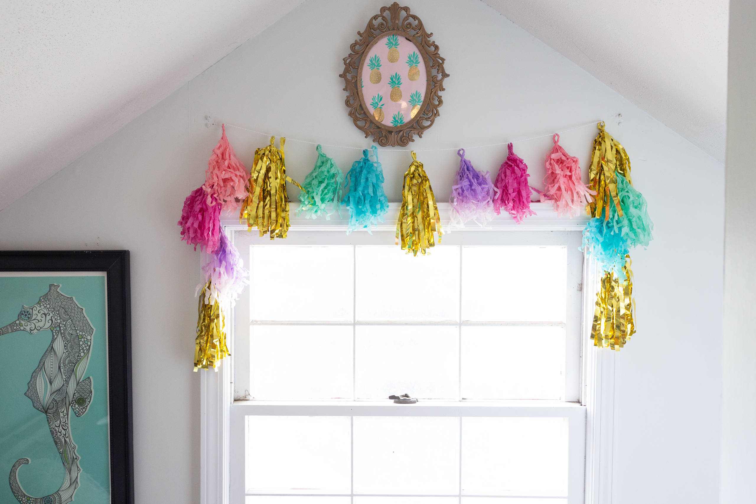 A tissue paper garland and framed prints add additional color to the white walls.