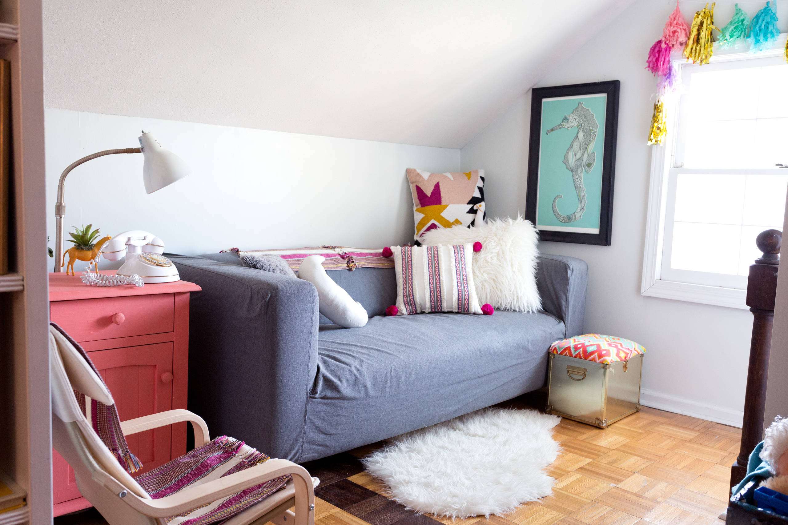 The couple decided to keep the original parquet flooring in the attic. This space is also decorated with a bright color palette. “Color has always influenced me whenever decorating our toddler’s spaces. I love bringing in bright pops of color with different DIY accessories and projects,” Audrey says.