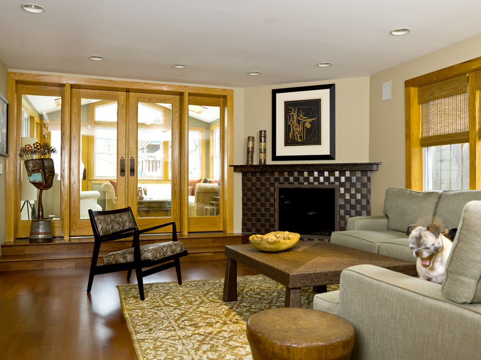 The family room renovations also started with a completely new color palette. The Hohmans tore up the old laminate floors, replacing them with hardwoods. The cherry wood warms the room without overpowering it, unlike its peach predecessor. The previously peach walls were painted a neutral color. The original fireplace surround featured patterned tiles, and the Hohmans replaced them with tiles from Ann Sacks. A signed Picasso lithograph hangs above the mantel to complete the look.