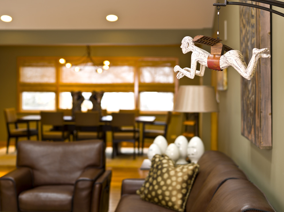 The suspended flying man is by Jonathan Forrest Read. The couple found this piece at the St. Petersburg Clay Company in Florida. "We liked his work based on his unconventional idea — a human figure drifting through the air without care," Karen says.