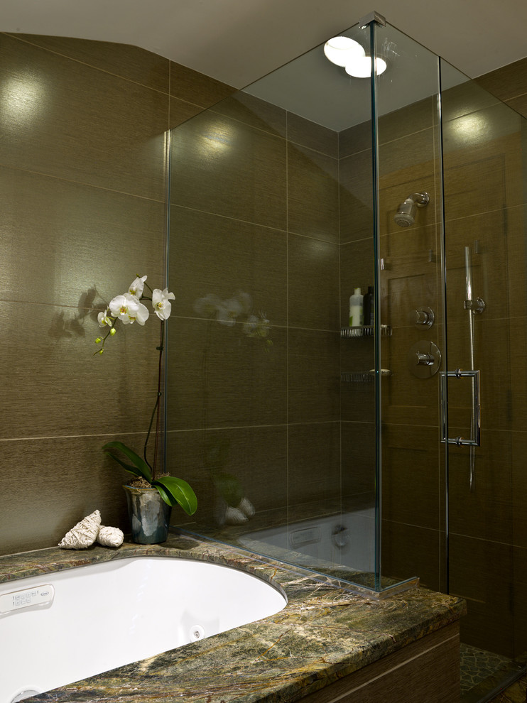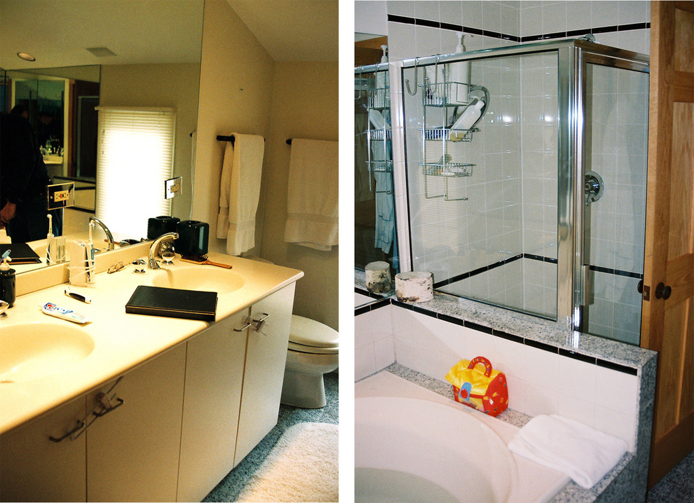The Hohmans completely gutted the shower, removing the doors with chrome trim and replacing them with glass panels. They incorporated new tile and fixtures and painted the ceiling white.