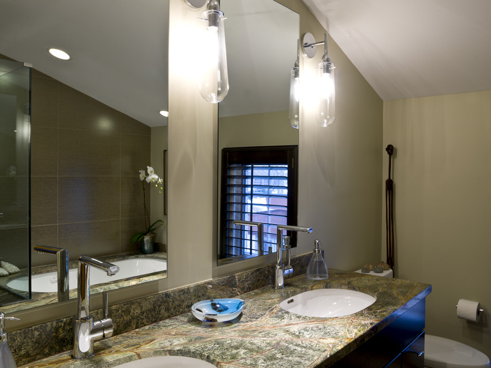 AFTER: The bathroom sinks and cabinetry were replaced with modern faucets, and rainforest marble adorns the his-and-hers sinks.