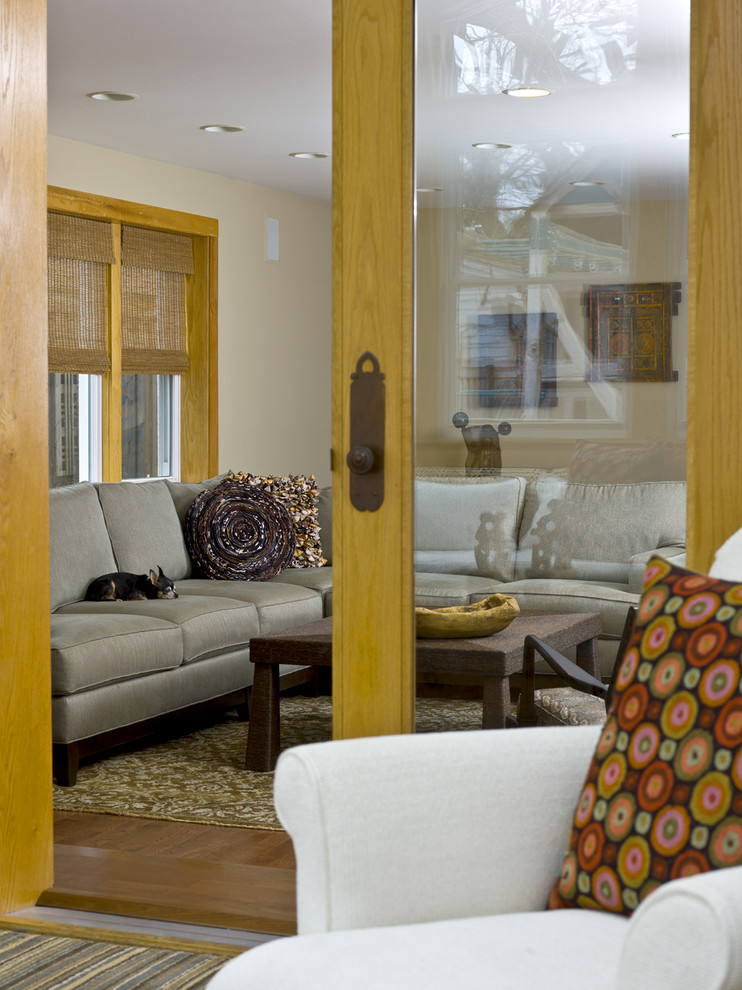 The glass doors are original to the house. The comfy sectional serves as the perfect nap spot for the Hohmans' four chihuahuas.