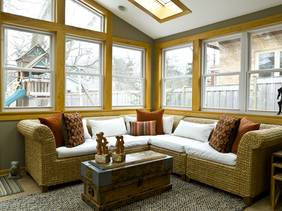 The sunroom also underwent a color transformation. Previously, dark colors on the ceiling and dark furniture dulled the space, and the Hohmans chose a soothing sage green and replaced the outdated seating with bright and inviting furniture. The sunroom looks out to the backyard and connects to the family room.